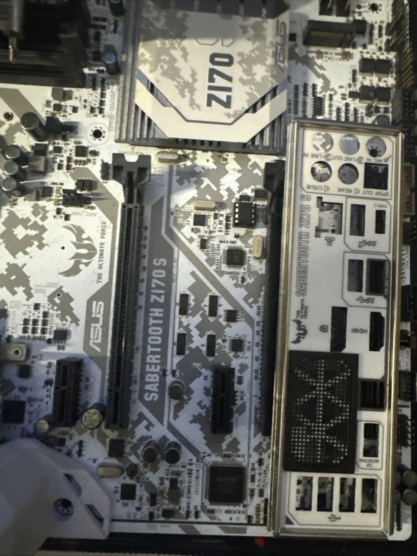 ASUS SABERTOOTH Z170 S Motherboard (Intel Z170, LGA 1151) The ASUS Sabertooth Z170 S is a high-durability ATX motherboard built on Intel’s Z170 chipset, designed for stability, longevity, and solid performance. Featuring ASUS’ TUF components and thermal design, this board is ideal for reliable gaming rigs, home servers, or workstation builds. Key features: • Intel Z170 chipset • LGA 1151 socket (supports 6th & 7th Gen Intel Core CPUs) • ATX form factor • Dual PCIe x16 slots for GPU expansion • Multiple SATA ports for SSDs and HDDs • USB 3.0 support • Reinforced TUF components for enhanced durability • Military-inspired white/gray camo design Perfect for anyone looking to build or refurbish a dependable system with proven ASUS quality. I’m