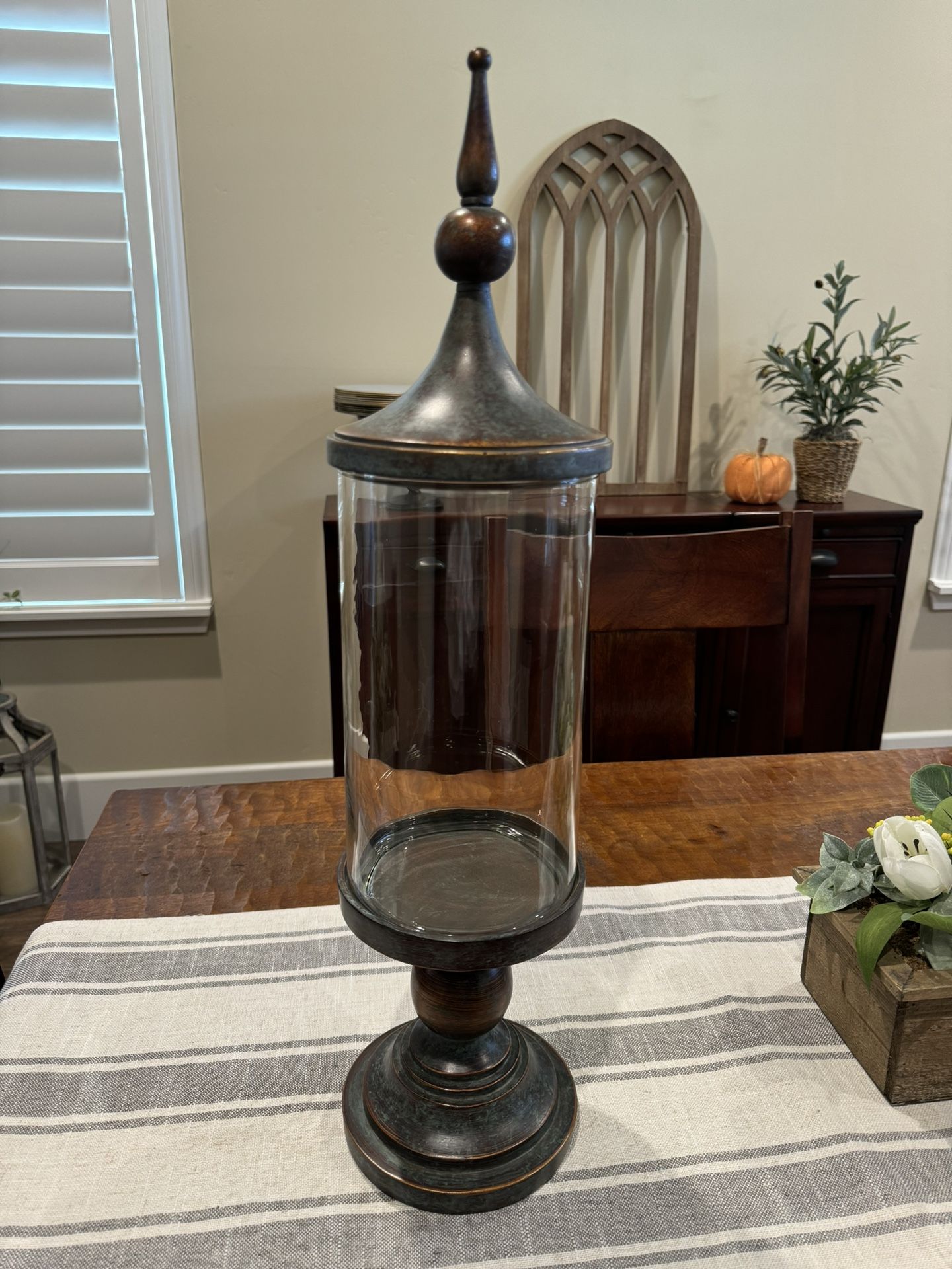 Southern Living at Home Renaissance Hurricane Beautiful tall hurricane has an old-world design. Hand-blown removable glass insert rests on the decorative oxidized copper-colored resin base, which allows you to style with seasonal objects, candles, and more. Remove lid for use with candles. (6" diameter x 24½" tall) Pickup only in Clovis