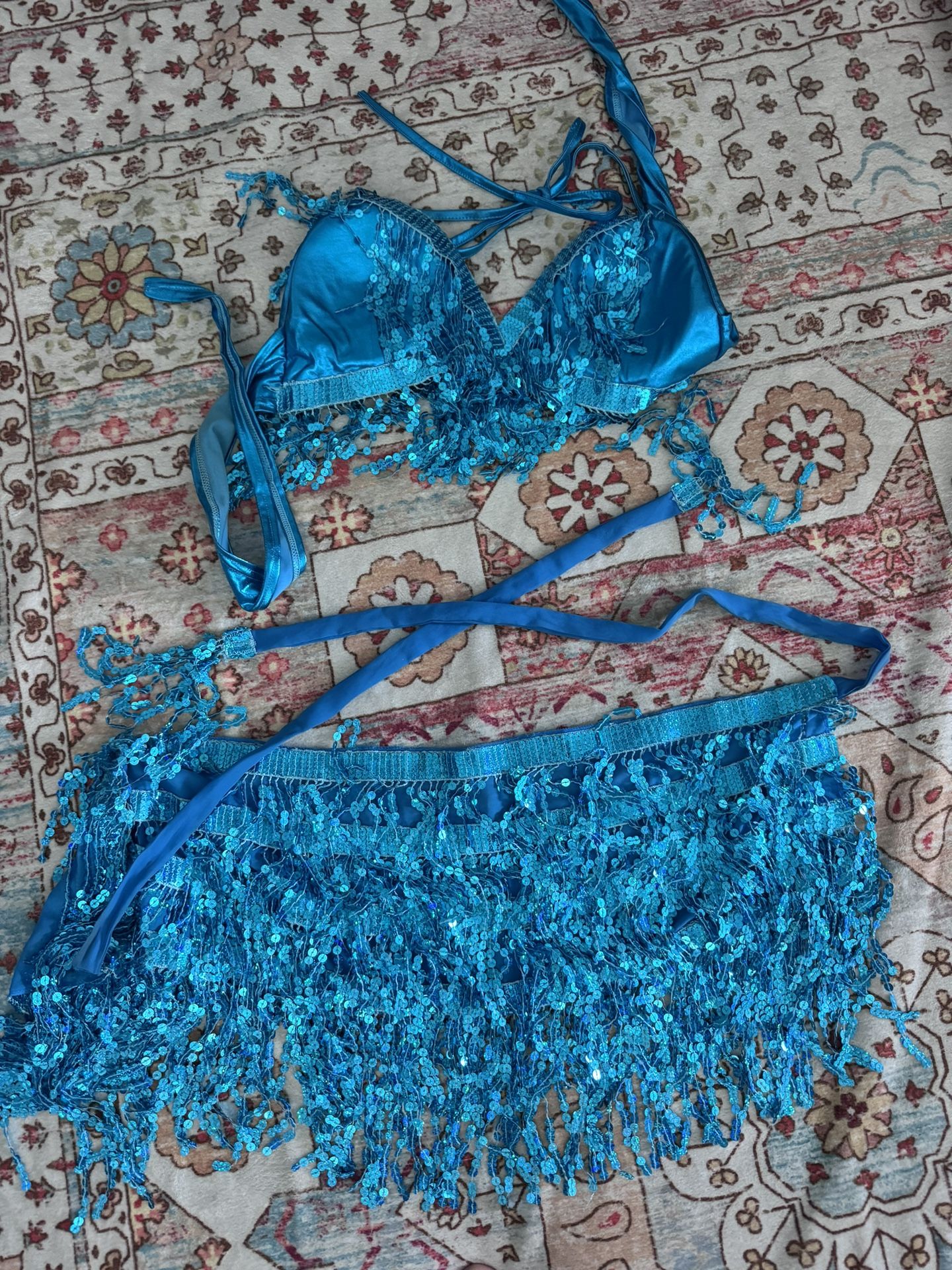 Ladies mermaid , cheerleader, dance costume great for halloween ! π. Like new womens petite sequin blue skirt and triangle bathing suit top. Size 6-8 small/ medium .