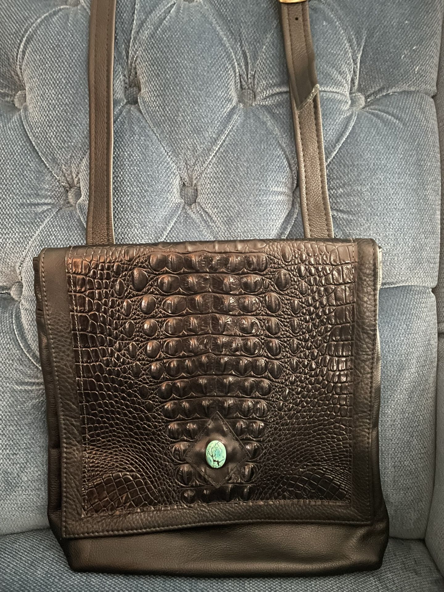 Black leather shoulder bag / purse with turquoise nugget on flap New Suede interior 12” x 12” x 2 1/2” Adjustable shoulder strap Outside and 2 inside zippered pockets 2 inside pouch pockets Metal magnetic snap Beautiful bag!!!!