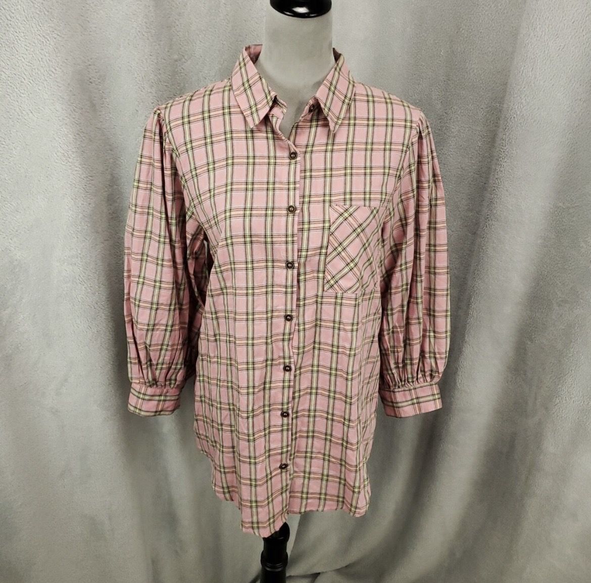 Like new, pink plaid blouse by Umgee. Pink with purple and light green stripes, metal buttons, puffy 3/4 sleeves, front chest pocket. Pit to pit-20” Length-23”