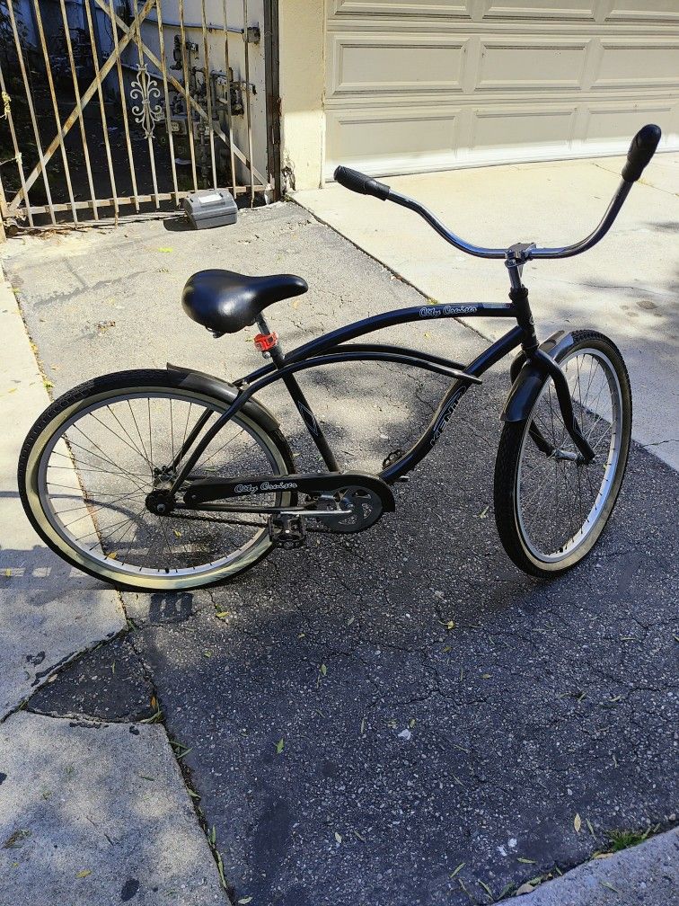 26" Men's Black Beach Cruiser. Single gear. Phone holder. Tire pump. Water bottle holder. Hardly used. Bought E-bike.