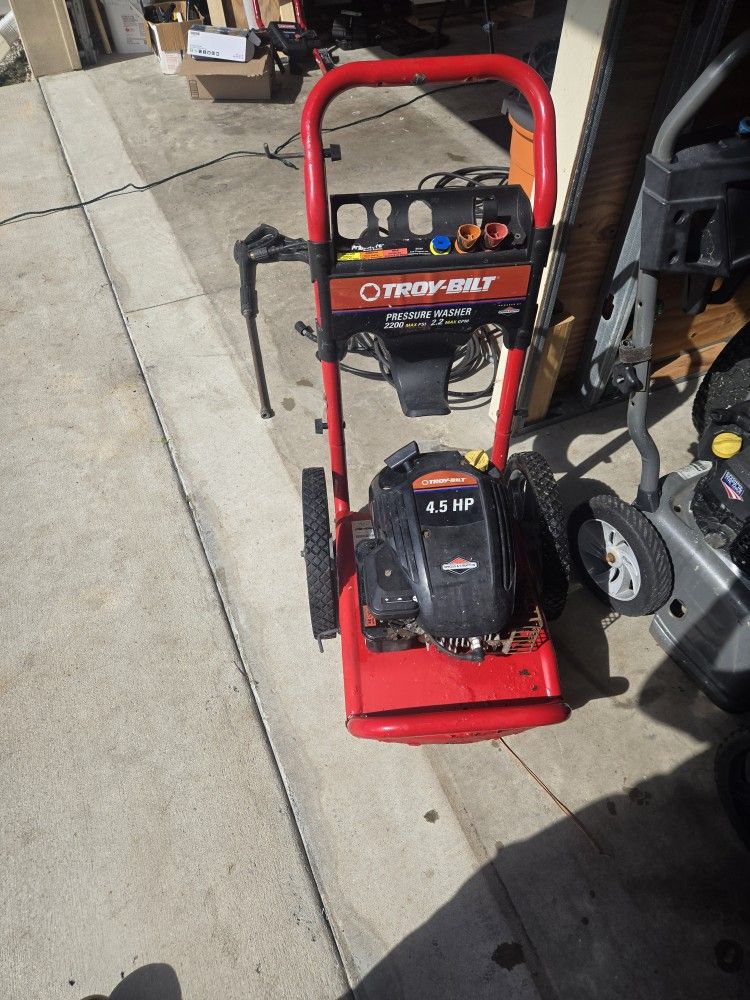 4.5 Hp Troy Bilt Pressure Washer, fully service in perfect running condition with wand. Max psi 2200 2.2 max gpm , Briggs & Stratton engine, new spark plugs, carburetor, filter. Start on the first pull.