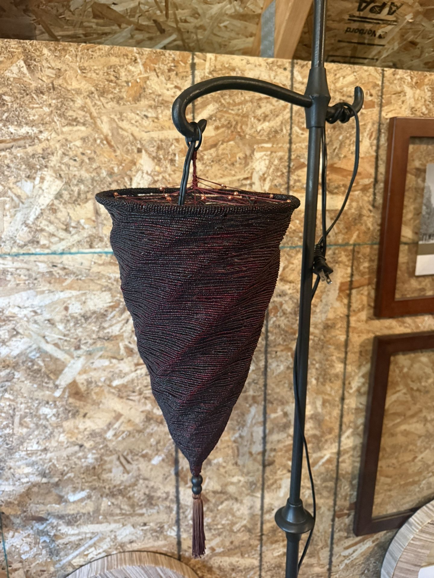 Pottery barn vintage style iron floor lamp The lamp is made of glass beads Rich burgundy /red lamp shade has a dimmer switch !!!! Excellent condition