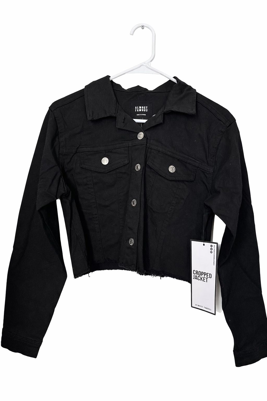 Trendy black cropped denim jacket with a structured fit and button-front design. Features chest pockets and raw hem detailing for an edgy, modern look. Perfect to layer over dresses, tops, or casual outfits. Size: S, L Price: $32 Payment methods: Cash, Zelle, or transfer #WomensFashion #CroppedJacket #OutfitOfTheDay #LatinaStyle #ClothesForSale