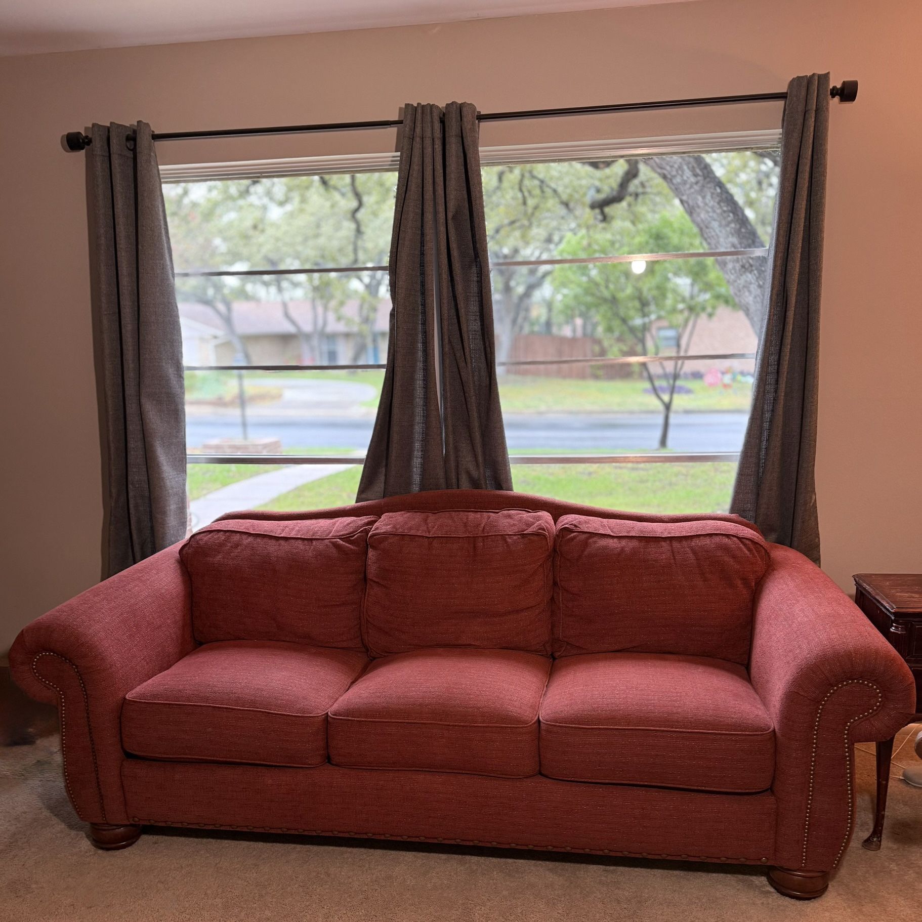Comfortable La-Z-Boy couch in a classic red/rust fabric with rolled arms and nailhead trim. Big, cozy, and great for a living room, office, or media space. Cushions are plush and supportive. Dimensions: 94” wide 40” deep 35” tall 20” seat height (floor to cushion) Condition: Great used condition (see photos). Local pickup, cash/Venmo/Cash App only.