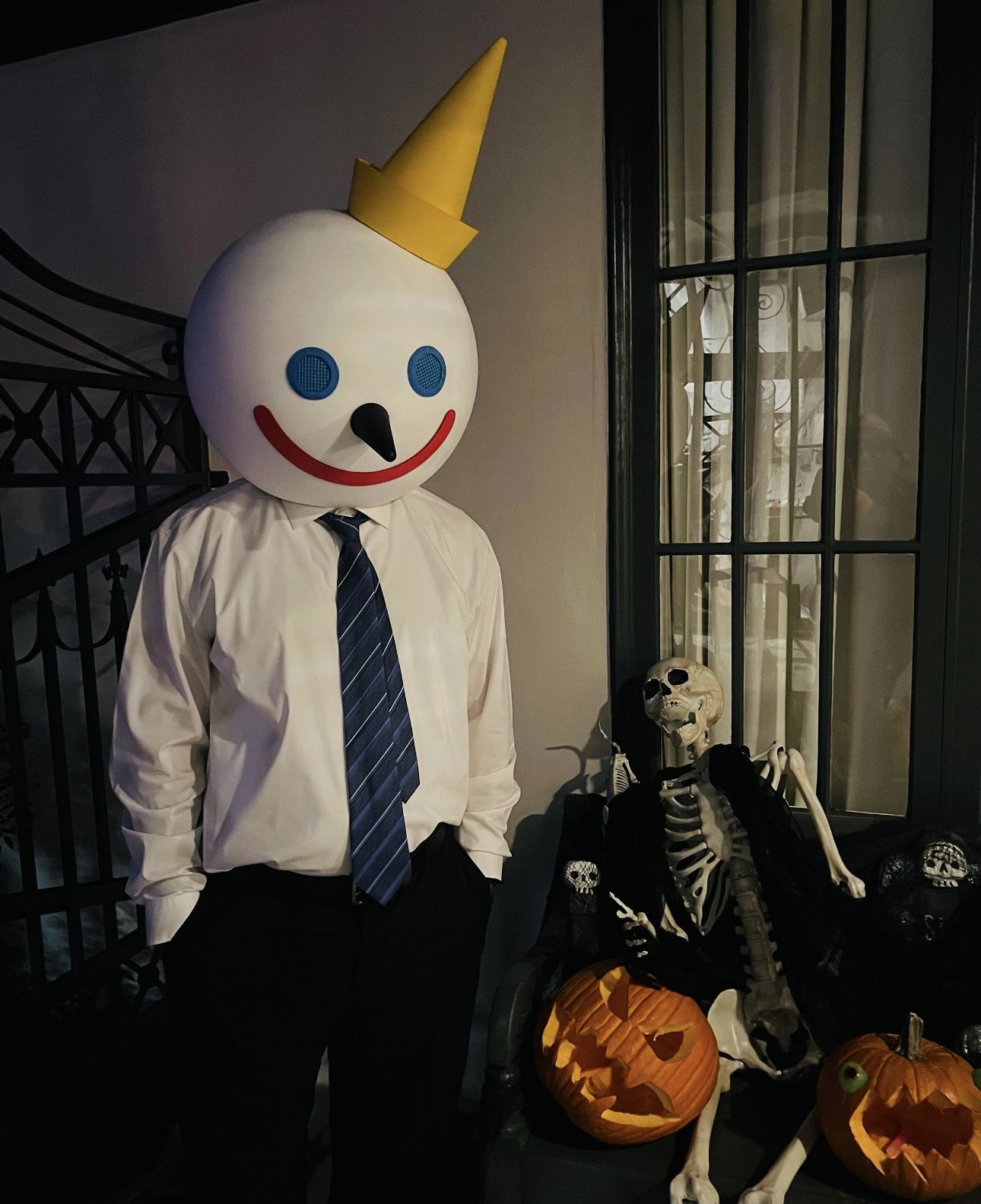 Jack in the box head Wearable Comes with glasses, hat, and 3 different smiles Fits adults and kids.
