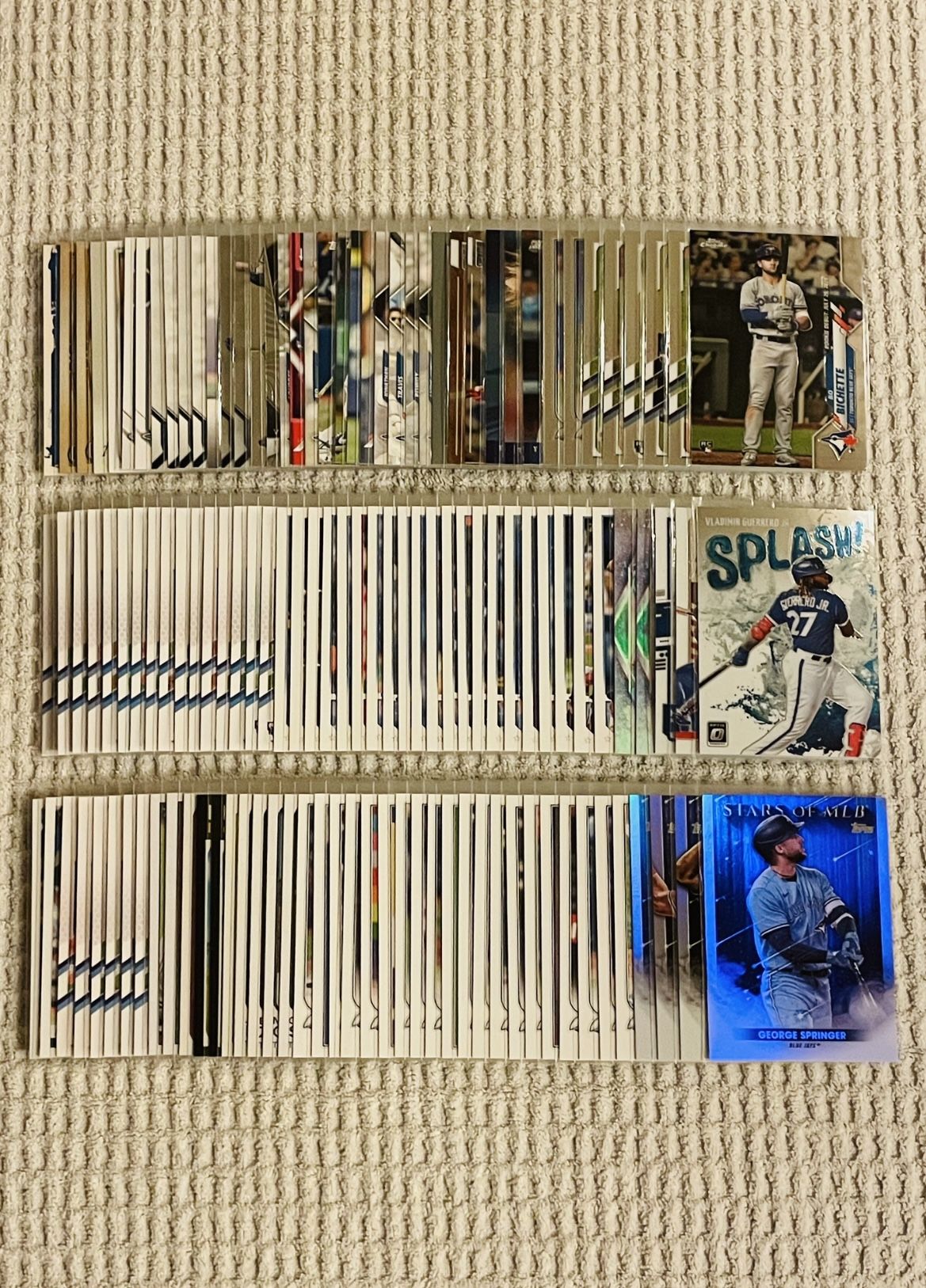 Toronto Blue Jays 125 Sports Card MLB Baseball Card Team Lot! All cards in mint condition! Rookies, prospects, All-Stars, HOFers, inserts, parallels, variations & more! Mix of Topps & Panini! Series 1, Series 2, Update Series, Heritage, Bowman, Bowman Chrome, Allen & Ginter, Diamond Kings, Opening Day, Gypsy Queen, Prizm, Mosaic, Donruss, Donruss Optic, Stadium Club, Stadium Club Chrome, Topps Chrome & more! Vladimir Guerrero Jr, Bo Bichette, George Springer, Matt Chapman, Whit Merrifield, Brandon Belt, Danny Jansen, Alejandro Kirk, Daulton Varsho, Cavan Biggio, Santiago Espinal, Otto Lopez, Chris Bassitt, Yusei Kikuchi, Kevin Gausman, Alex Manoah, Hyun-jin Ryu, Jose Berrios, Nate Pearson, Jordan Romano, Paul Molitor, Roberto Alomar & much more! $45 for the lot! Local pick up & shipping available. Message for details. Thank you!