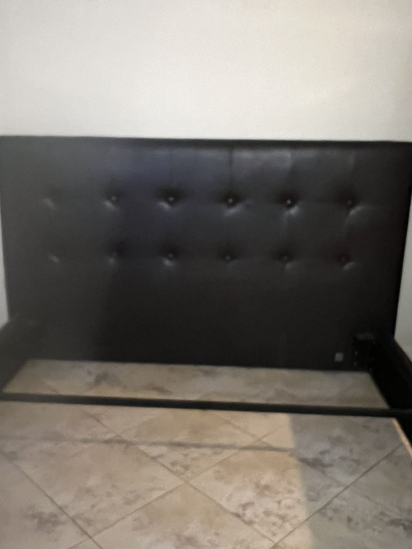 It’s a brown leather headboard, mattress frame with a king size bed mattress