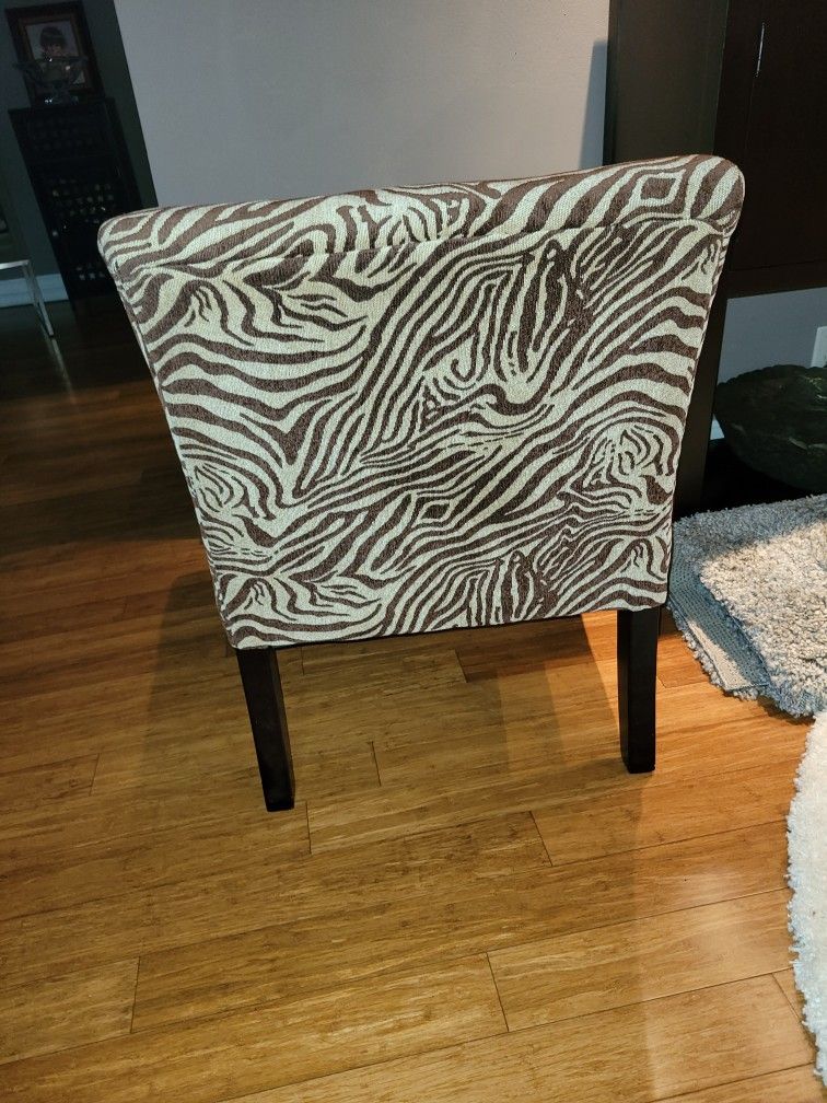 If the post is up, it's available. No need to ask. Click *see more* for details. Occasional Chair 22"w x 27"d x 32" h Zebra Chenille Fabric Brown Tones Good condition No tears Smoke FREE home Selling ASIS. Delivery within 10 miles available for $15.00 *Please check out my other post. Thanks Accent chair Contemporary Modern Comfortable Bedroom Living Room Den Designer
