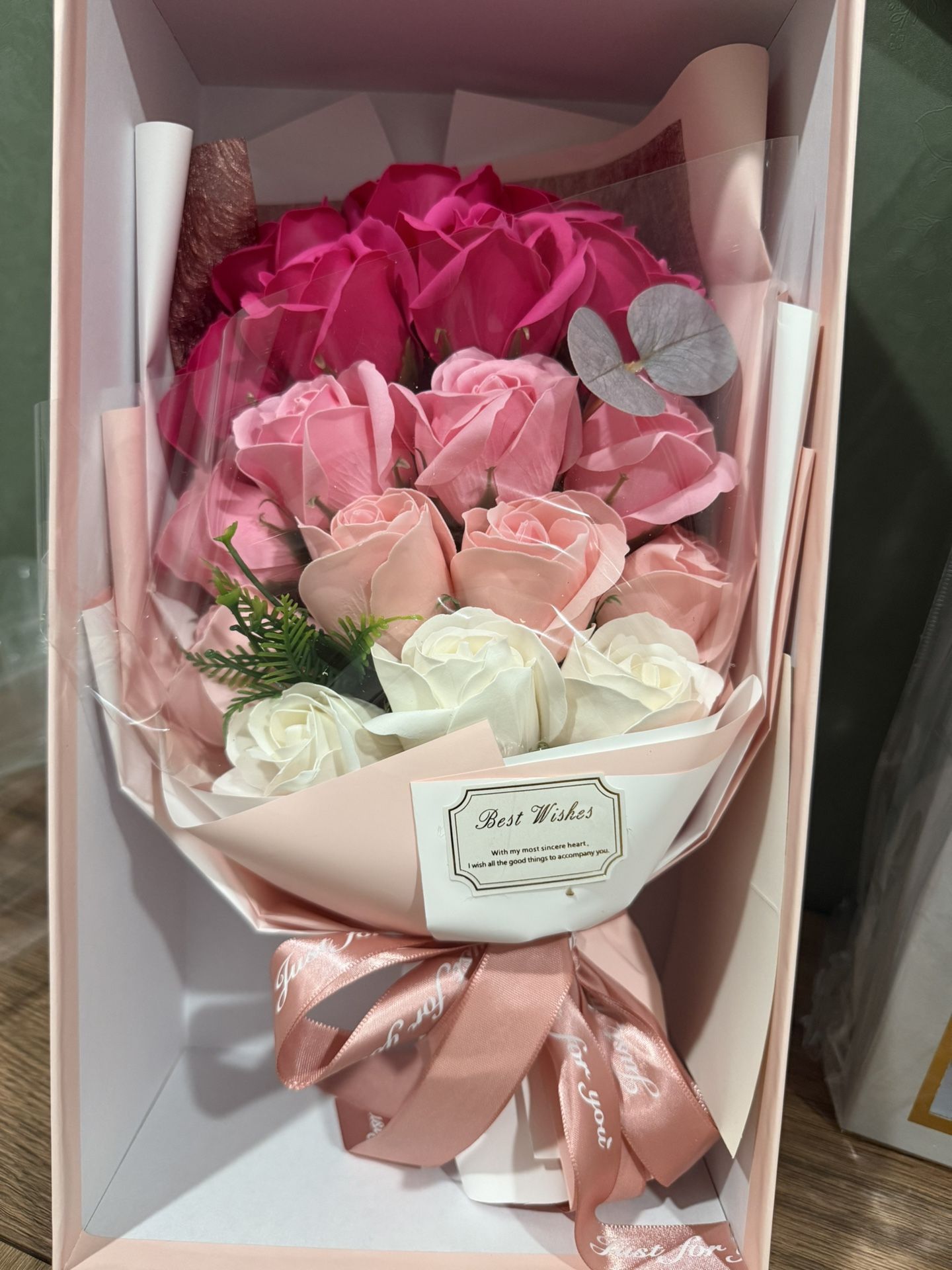 ombre bouquet with 18 soap roses varying in colors. Gift box and note card are included. Soap flowers are made with 100% soap ingredients and have a subtle soap scent. Soap flowers may be added to a bath for a beautiful relaxing fragrant bath and also makes a perfect gift for anyone with a flower allergy.