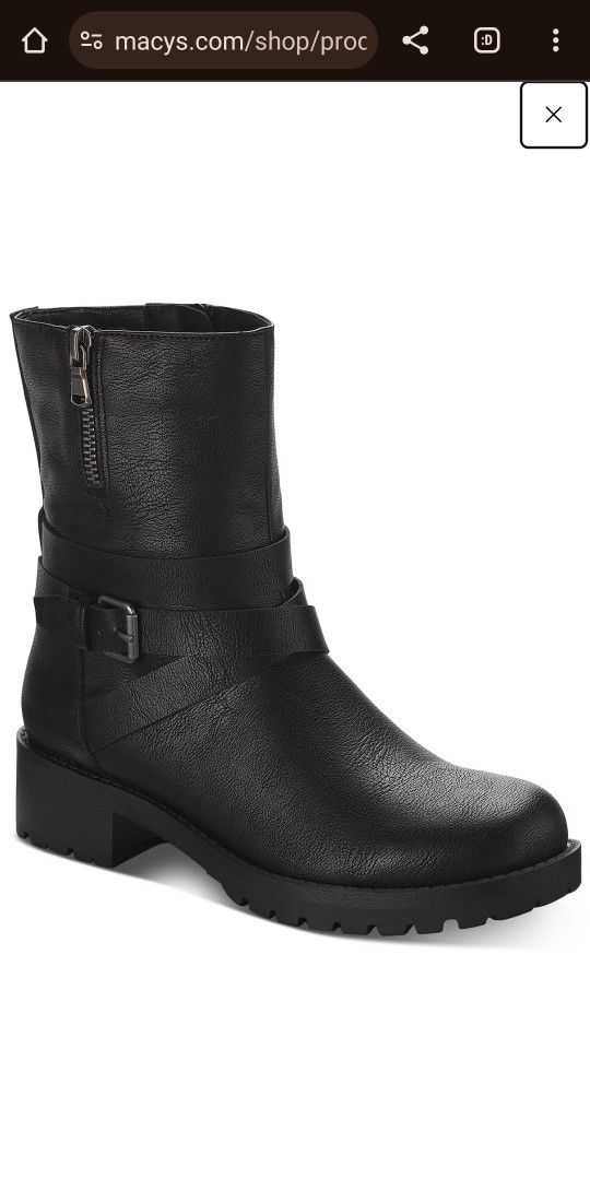 Buckled straps and a chunky lug platform elevate bold style with fresh moto-inspired flash in the Stellaa booties from Sun + Stone. 1-1/2" block heel; 3/4" platform Round-toe booties with inner ankle zipper closure Buckled strap detailing Cushioned insole and memory foam for added comfort