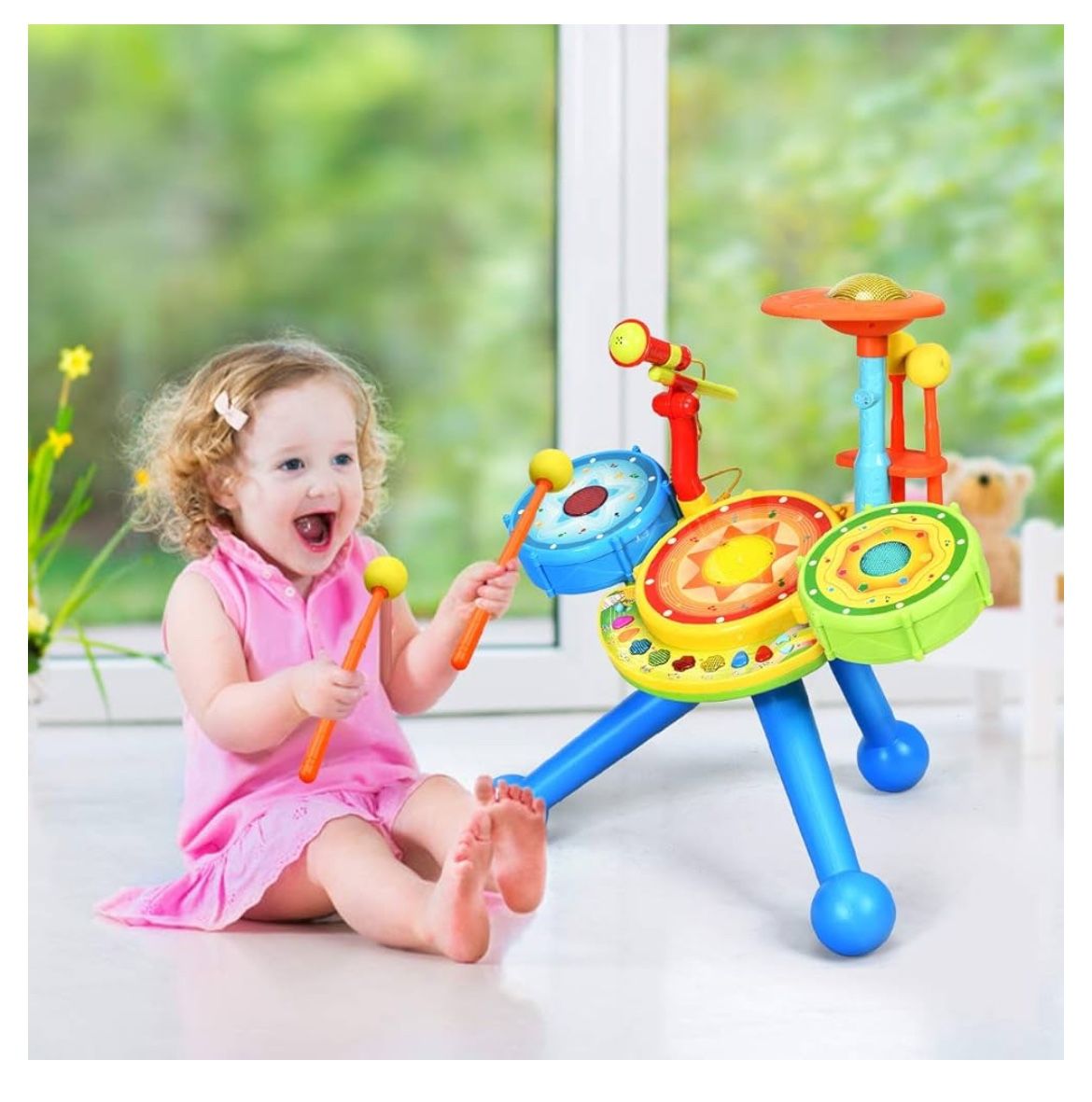 GYMAX Toy Drum Set, Volume Adjustable Musical Percussion Instrument with Stool and Microphone, Electric Jazz Drum Kit for Toddlers Kids Preschool Chil