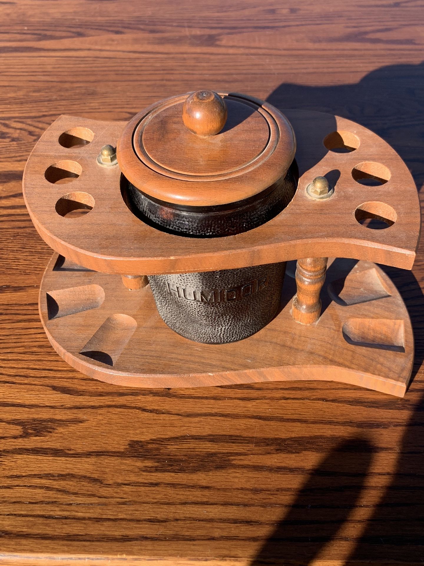 Vintage apothecary pipe rack with inset humidor, used, pipes included, excellent condition