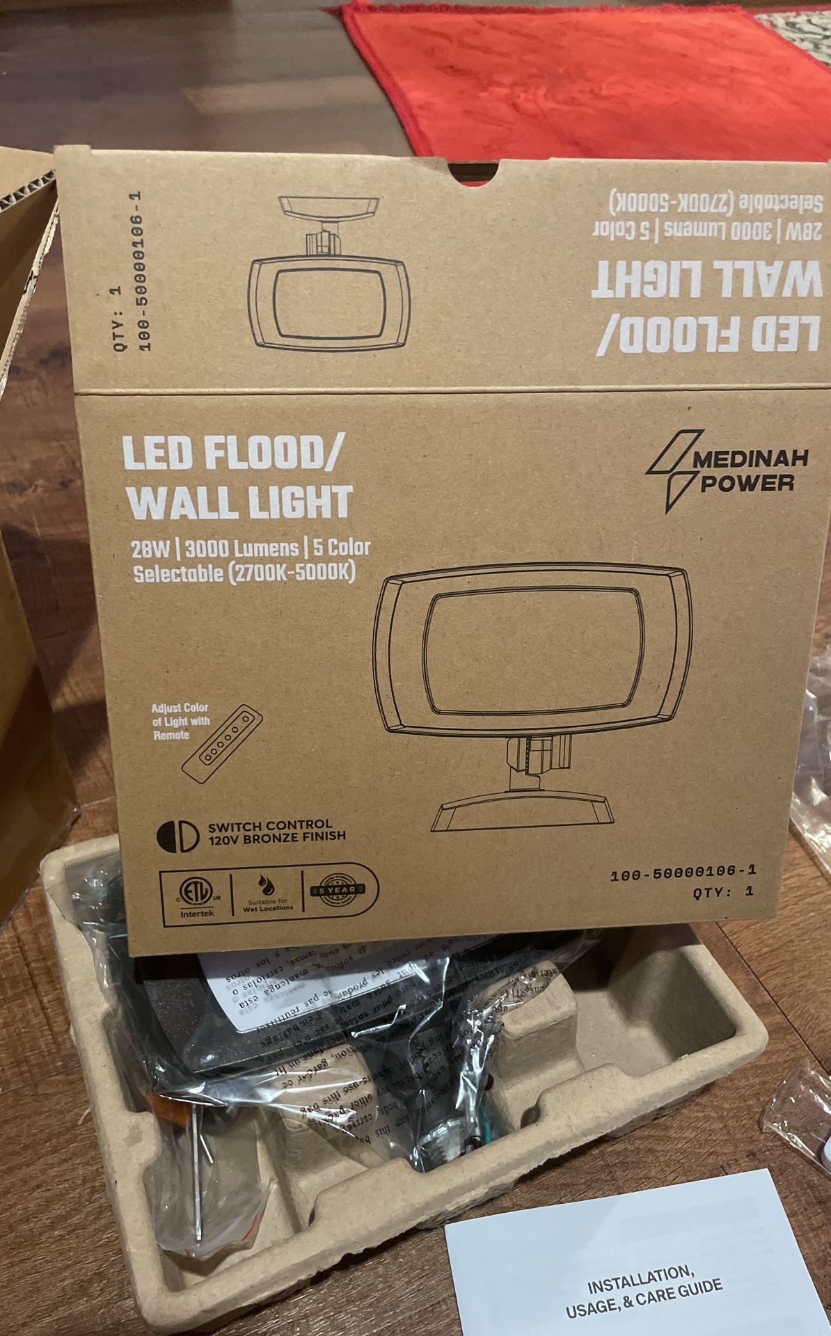 Led flood wall light that is 28watts, 3000 lumens, and 5 color adjustment color of light with the remote. One left I’m asking for 30 each set.