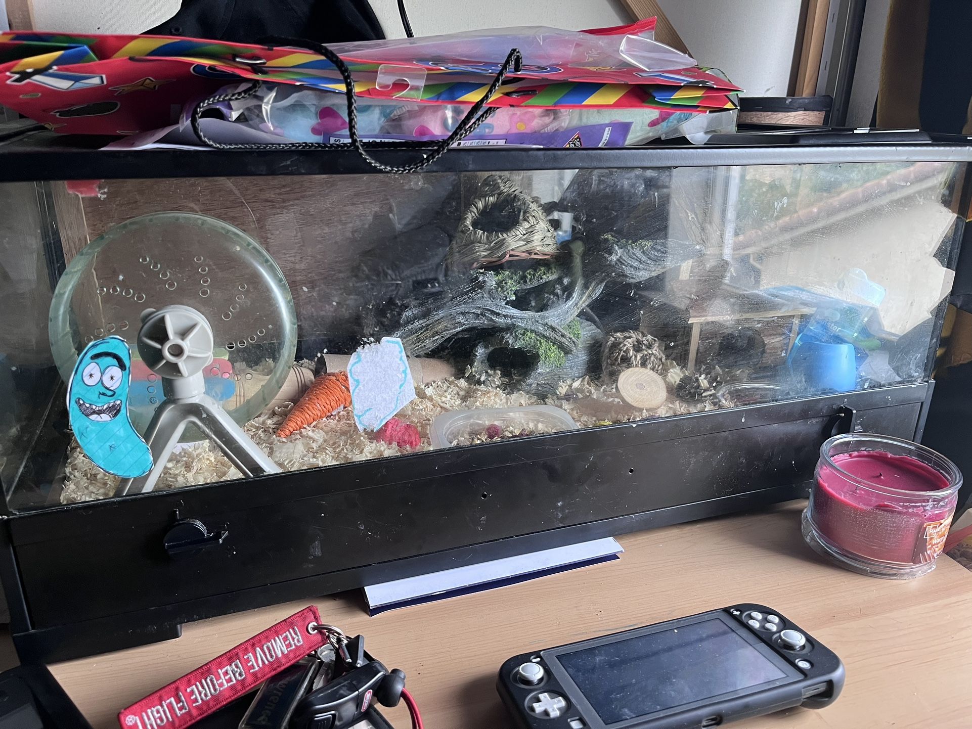 Our hamster passed away and we need to get rid of the cage . Its a reptile cage but worked perfectly for our hamster. If you would like the cage for a hamster everything comes included we are going to clean it out today so it will be good to go. Includes: 2 story hamster wooden house Smaller house Hamster wheel Water n food bowl A rock type of tunnel Tiki hut Huge bag of bedding Hamster food Chew treats
