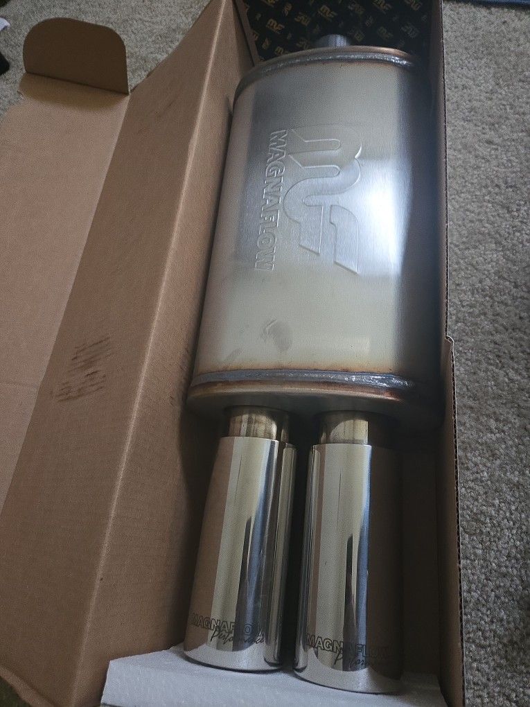 Never used (open box) Magnaflow universal muffler part 14815. Bought it to install on my car but opted for a full cat-back exhaust system. 2.25" inlet, 3"outlet. Dual exhaust tips.