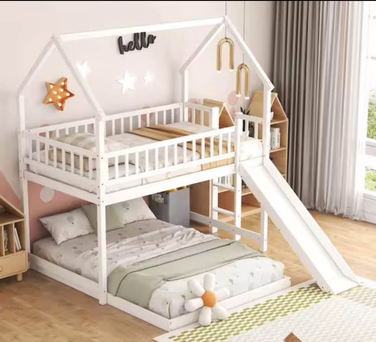 New in box, original price 459$ Harper & Bright Designs L-Shaped White Twin over Full Wood House Bunk Bed with Built-in Ladder and S