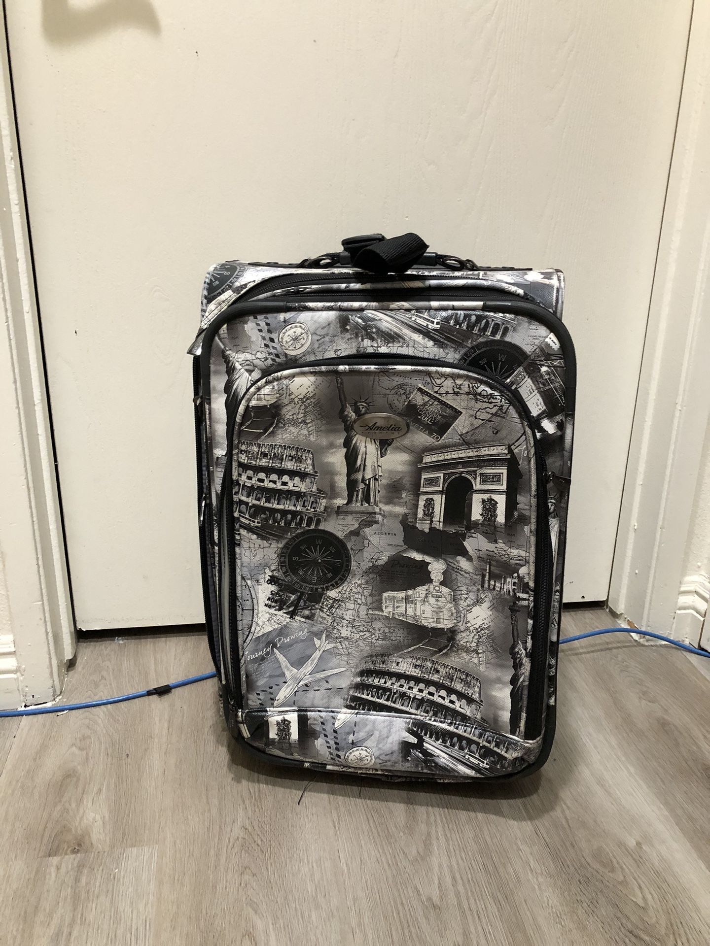 Perfect condition no flaws suitcase Used a few times It’s beautiful because it has different little historical places in black and white from different states / countries on the suitcase It has TONS of room 1 large pocket in the front , medium pocket in the back of the suitcase , belted hook to hang up on things if needed , handles and pull handle (pulls out smoothly) 4 pockets on the inside Great suitcase I just have too many suitcases now and need to get rid of some