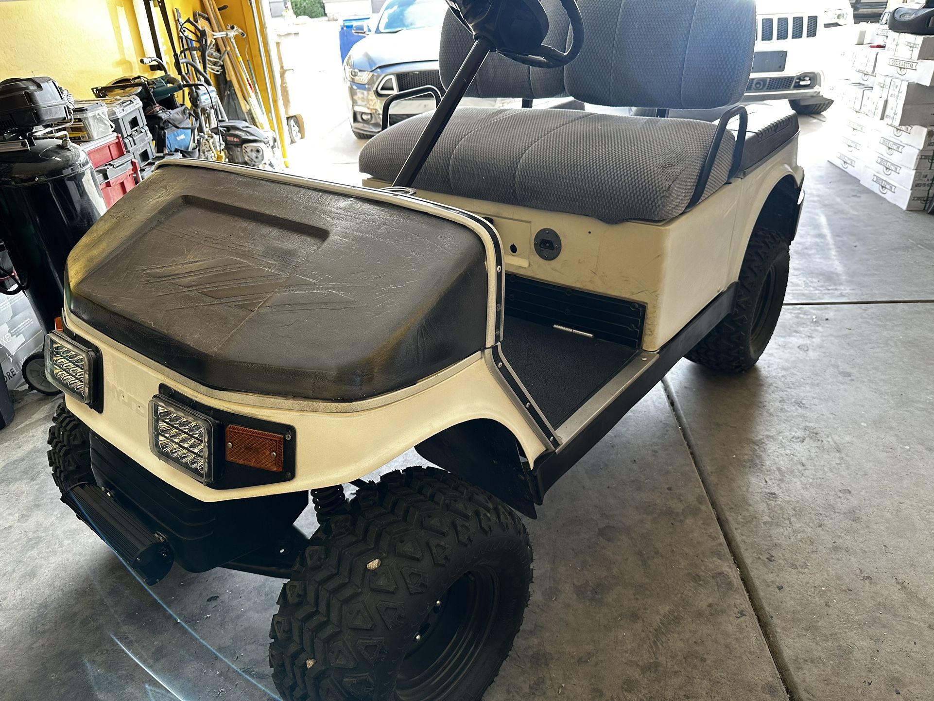 Hyundai golf cart Runs good Comes with charger Lifted with a arms Have roof and window to go with it just have it off Have stock wheels and tires to go with it also Along with few other parts Good cart to cruise the Nabor hood Asking 2000 obo Might be interested in a trade let me know what you have