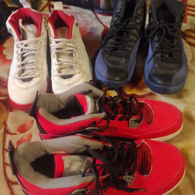 Selling lot of Jordans sneakers in mint conditions the red is size 11 the blue one is size 10.5 the white one is size 10.5 asking $200for the lot