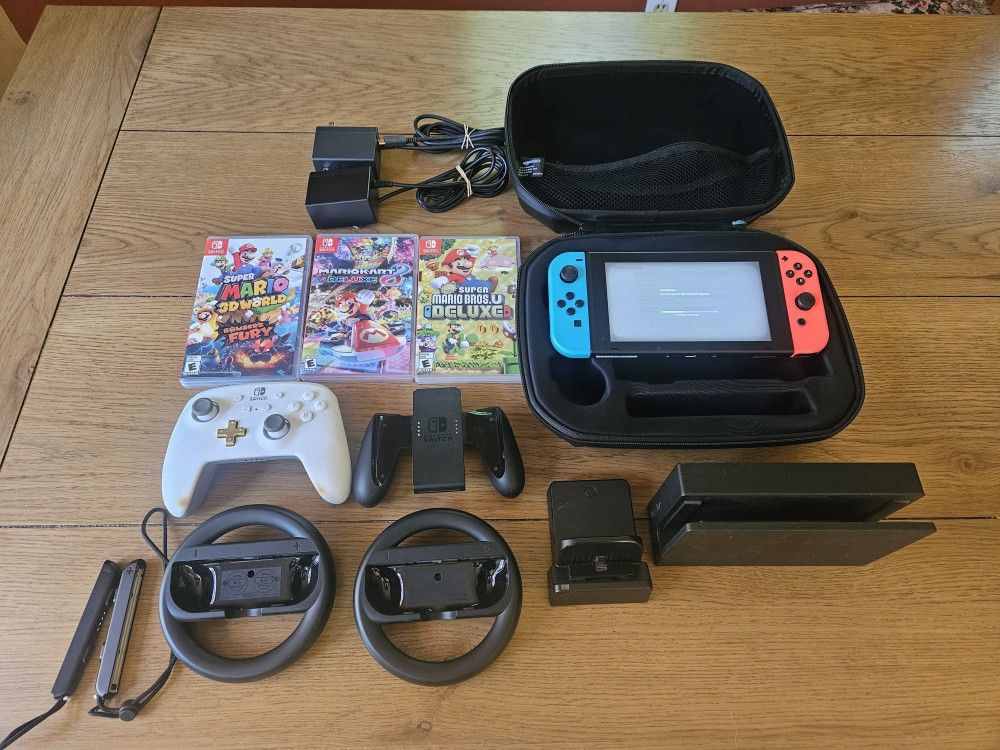 Original Switch. Barely used. 2 docking stations, 2 steering wheels, joycon controller, joycon set, pro controller, 3 games, hard shell travel case, 64gb SD card. $250 firm, no trades.