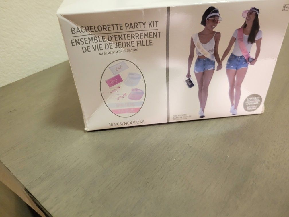 Brand new party kit for bride and 3 bridesmaids. Includes sash, visor, glasses and pouch for bride and bridesmaids.