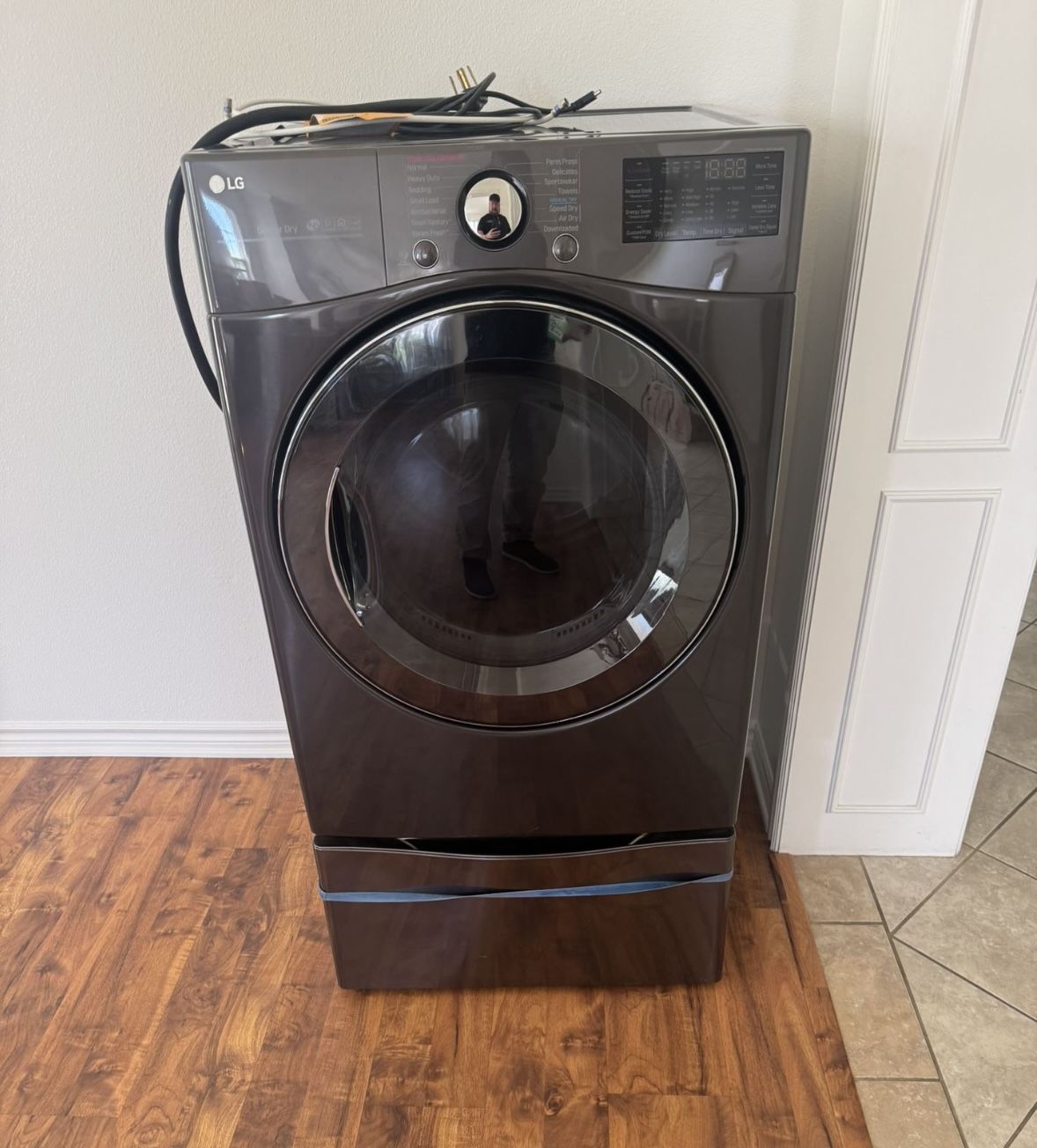 Dryer in excellent condition. Purchased 2 years ago but moved and new house only has a gas connection. Please see the photos for the type of plug this dryer has so that you can confirm it will fit your socket. Comes with pedestal. Model DLEX3900B 27 Inch Electric Dryer with TurboSteam™ Technology LG's TurboSteam™ technology generates steam instantly, so reducing wrinkles and odors is a breeze. That means you can get your favorite shirt back in tip-top shape in just 10 minutes. This dryer is equipped with a sensor dry system that measures the moisture levels during the cycle and automatically adjusts the drying time to help ensure you get dry laundry every time. Choose from 14 cycles such as Normal, Heavy Duty, Bedding, Small Load, Anti Bacterial, SteamSanitary™, SteamFresh™, Perm Press, Delicates, Sportswear, Towels, Speed Dry (Manual Dry), Air Dry (Manual Dry), and Downloaded for special care for any type of fabric. Expand the limits of your laundry room with the LG SmartThinQ® app. Select a cycle, start or stop the wash and get notifications about when your laundry will be done, all from your smartphone. It even works with the Google Assistant and Amazon Alexa, so you can manage your laundry with simple voice commands.