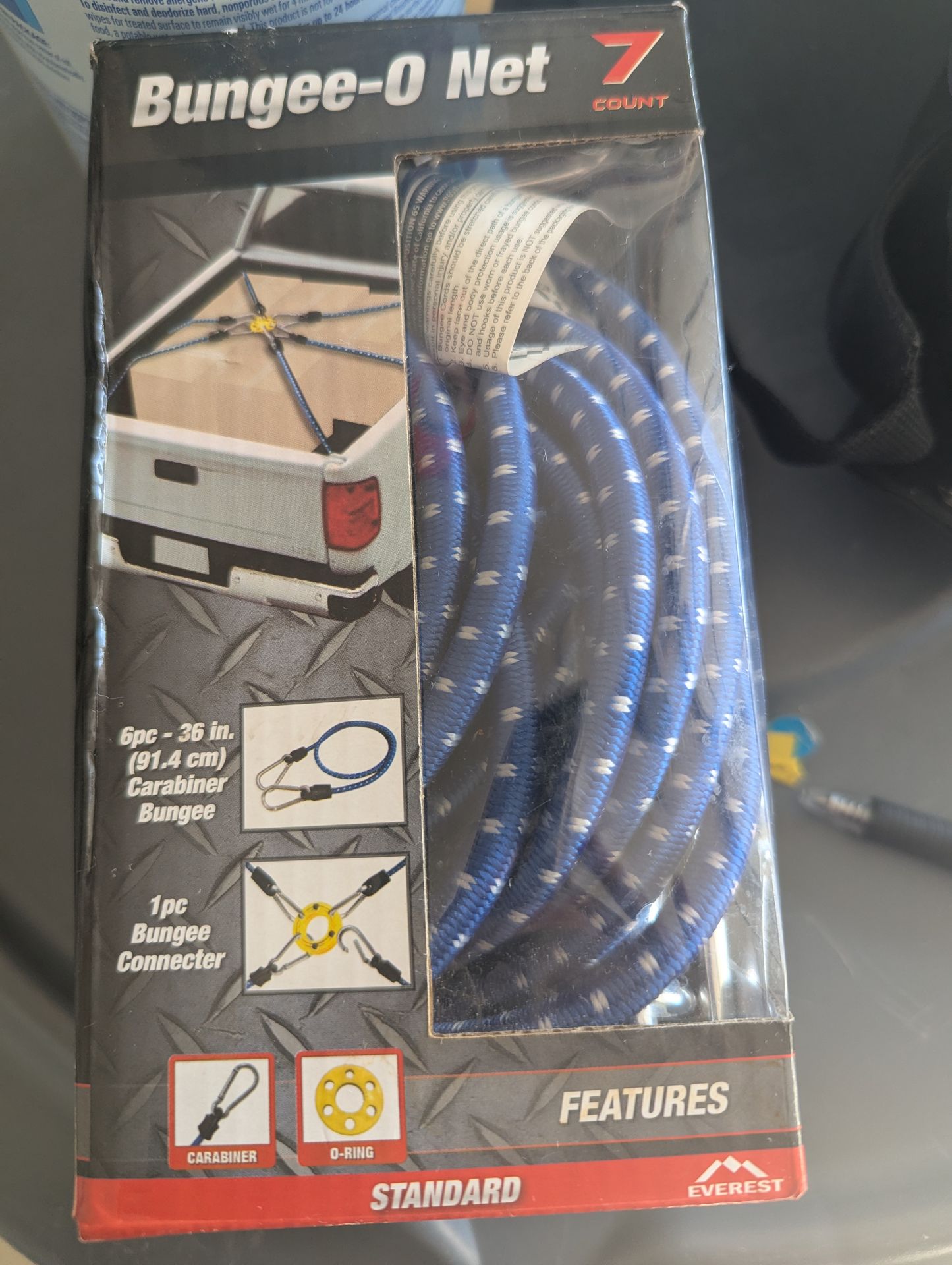 Versatile Everest Bungee-0 Net set. Got 7 pieces total. Includes 6 carabiner bungees, each 36 inches (91.4 cm) long. Also has 1 innovative O-Ring connector. You can use this to make a flexible cargo net for securing stuff, like in a truck bed. Still in package. Auto reply to availablity messages Save time by letting Meta Al automatically reply to