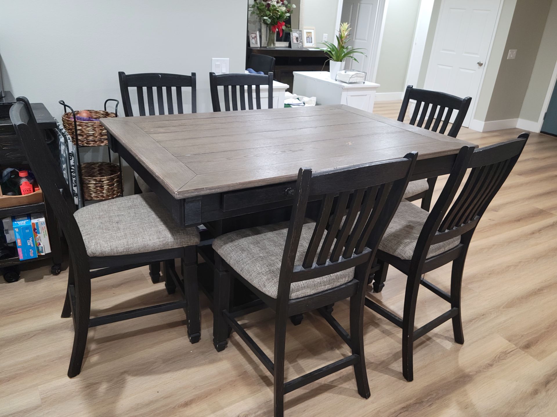 Used, great condition. Table with 6 stools. Bought from Ashley's. New table with 4 stools currently retails for $1899.99 + tax. Make an offer.
