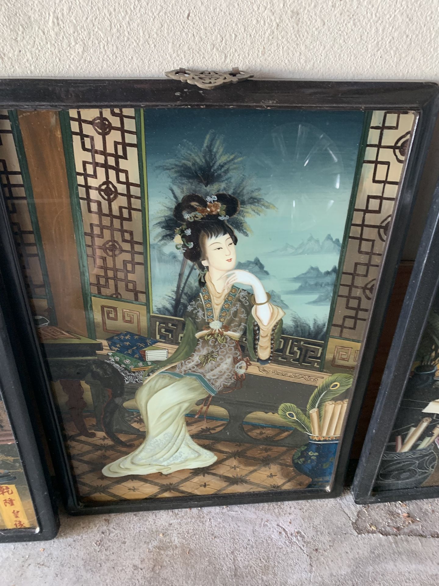 4 chinese reverse glass paintings with wood frames these are really cool have no place for them sad to see them go. Very unique artwork. 19 1/2 W- 27 1/2L