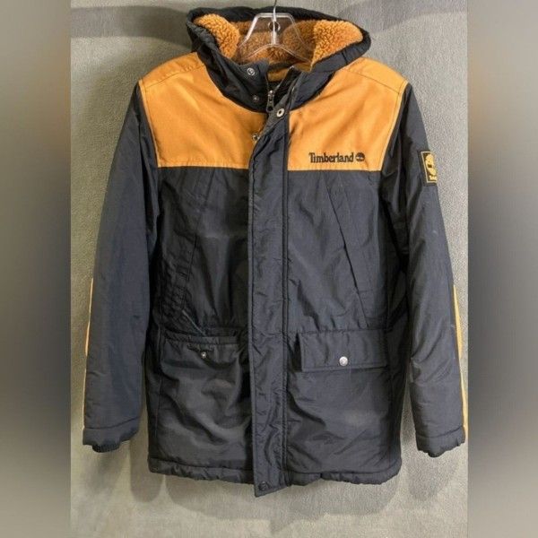 Stylish Timberland jacket with a hood. Features a black and tan color scheme. Perfect for cold weather.
