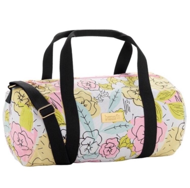 NEW Floral Duffel Bag by Benefit Cosmetics Details: - limited edition - medium 17.5” L x 10.5”H x 10.5” D - soft midweight canvas material - secure gold zipper closure - shoulder strap + 2 handles - carry all floral duffel bag - makes a great gym bag or weekender bag