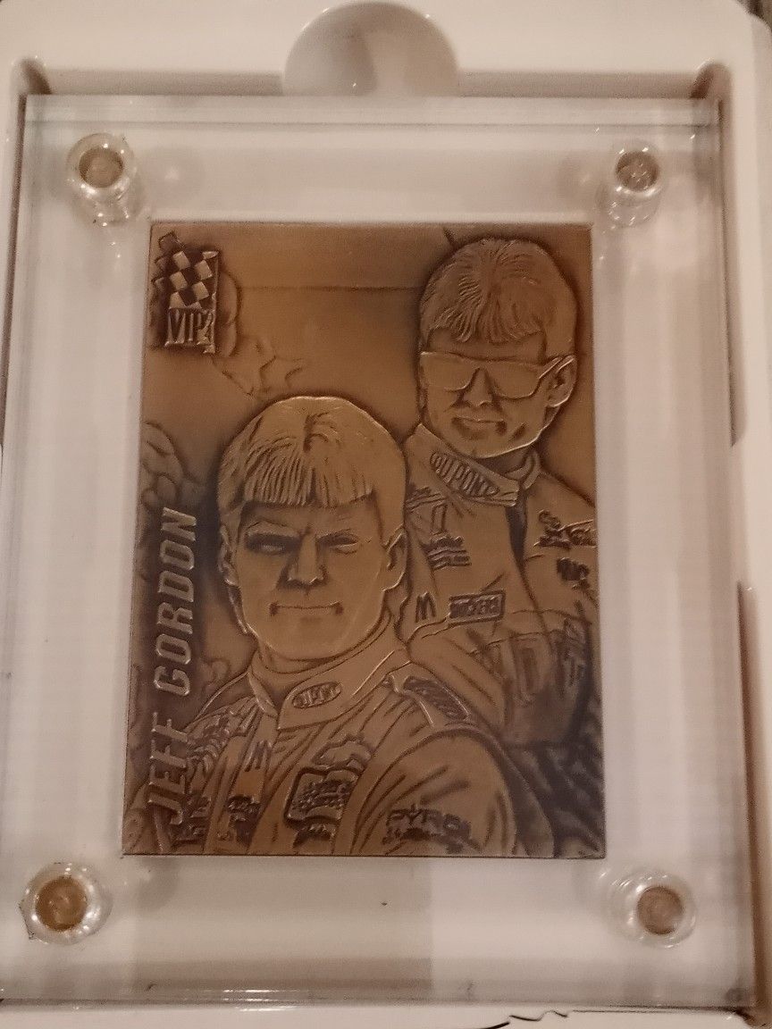 Jeff Gordon bronze die-cast card very good detail. Has certificate of authentication with it the card and holder is in good shape the plastic holder has a tare on the inside.