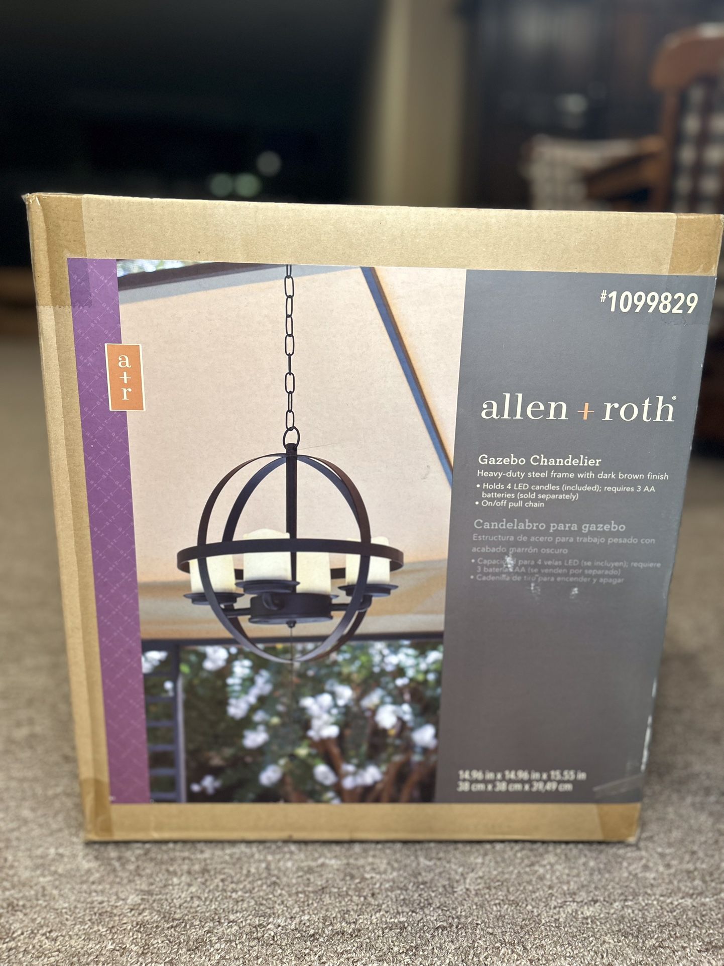 It is a steel chandelier which is good for outdoor uses such as gazebos. Features include: - Heavy-duty steel frame with dark brown powder coated finish - Holds 4 LED candles (included) - No assembly needed - Battery operated NEW IN BOX. Retail for ~$120, selling for $40 OBO.