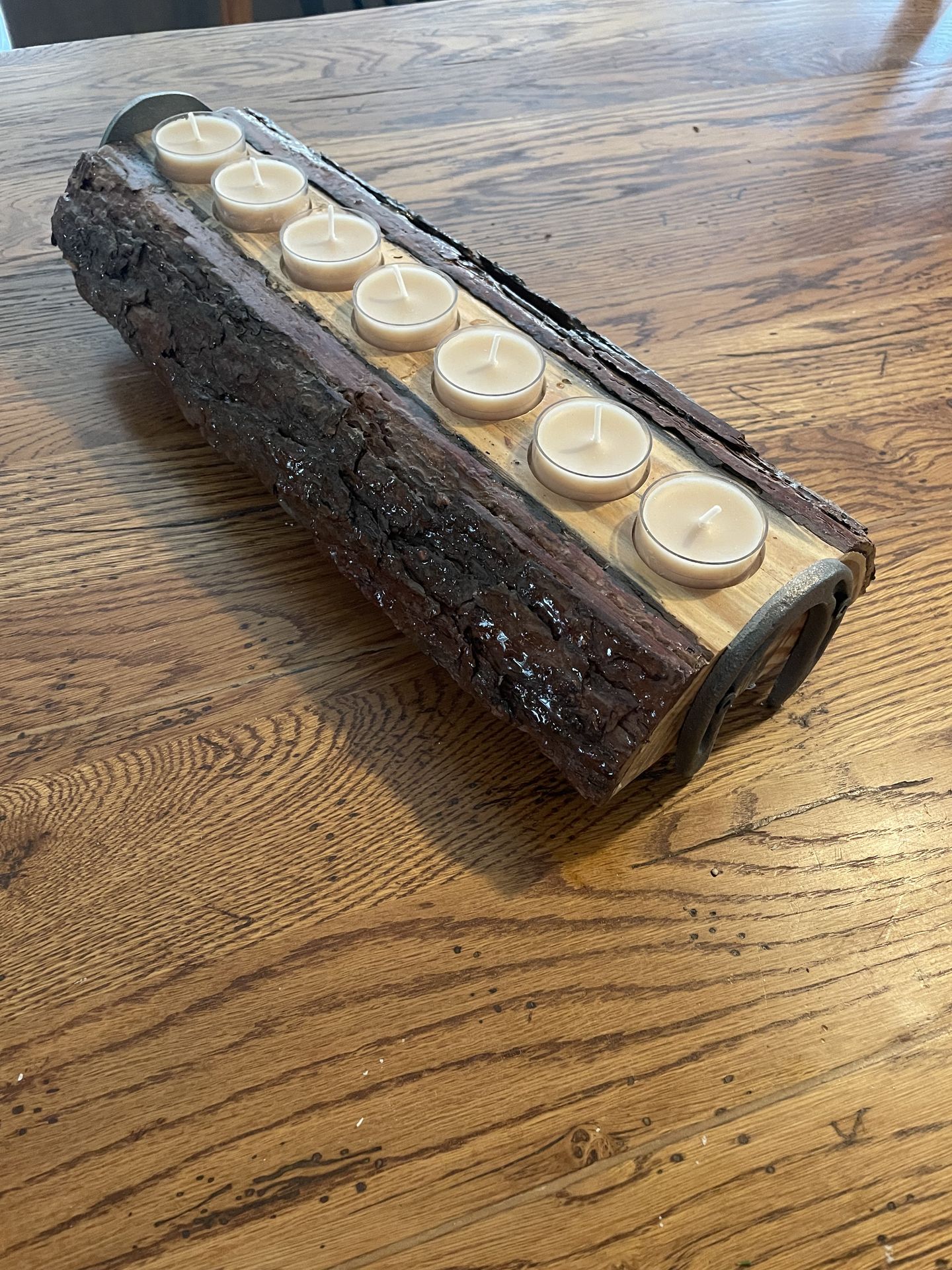 Wooden log candle holder Decorative horseshoes on sides Includes candles 5 x 14 x 4H Brand new never used