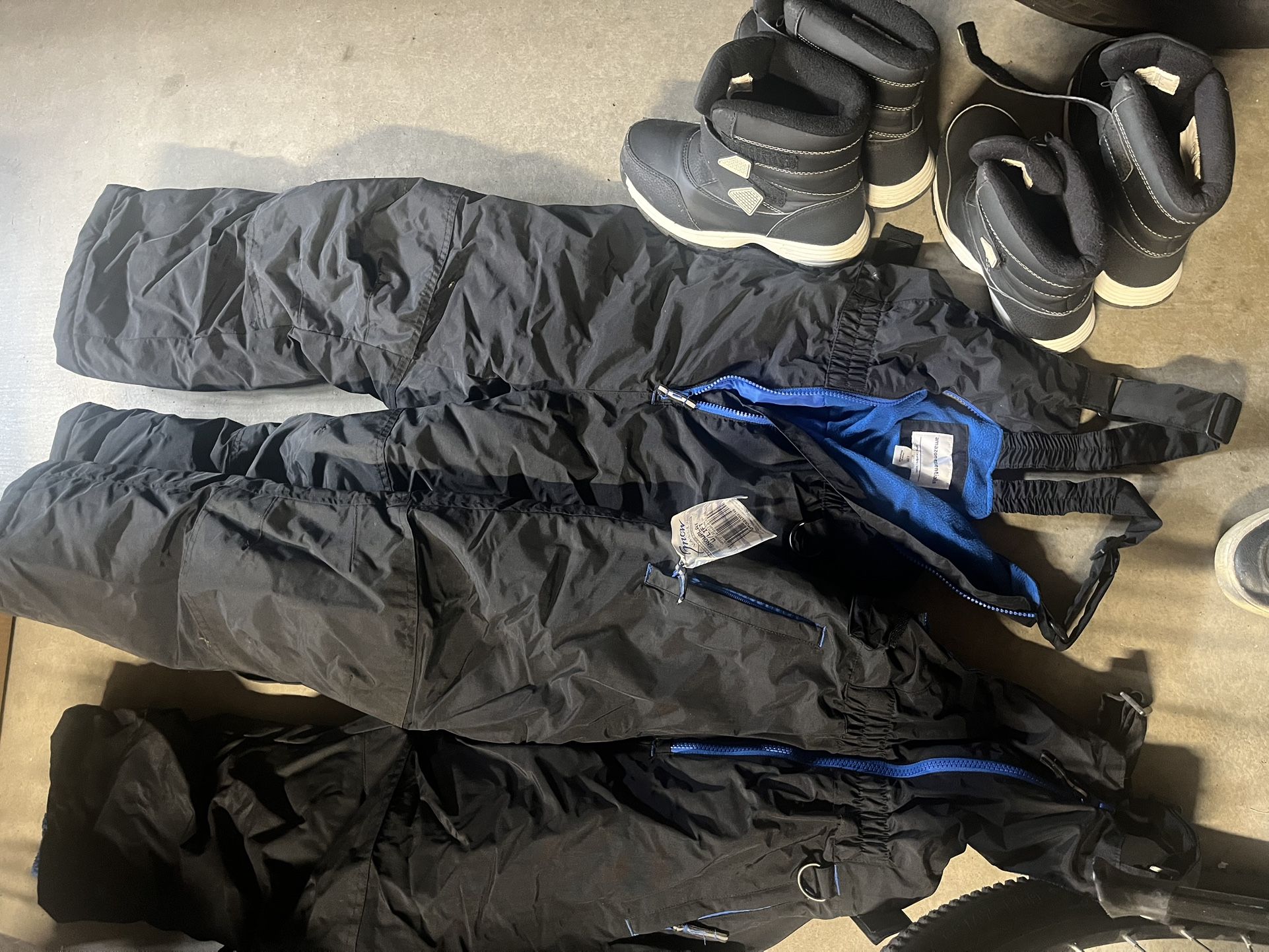 Used for one trip to the snow last season. Snow boots are sizes 2 and 4. Bibs are size medium and large (youth). Asking $15 each for bibs and $10 each for boots, or make an offer for all