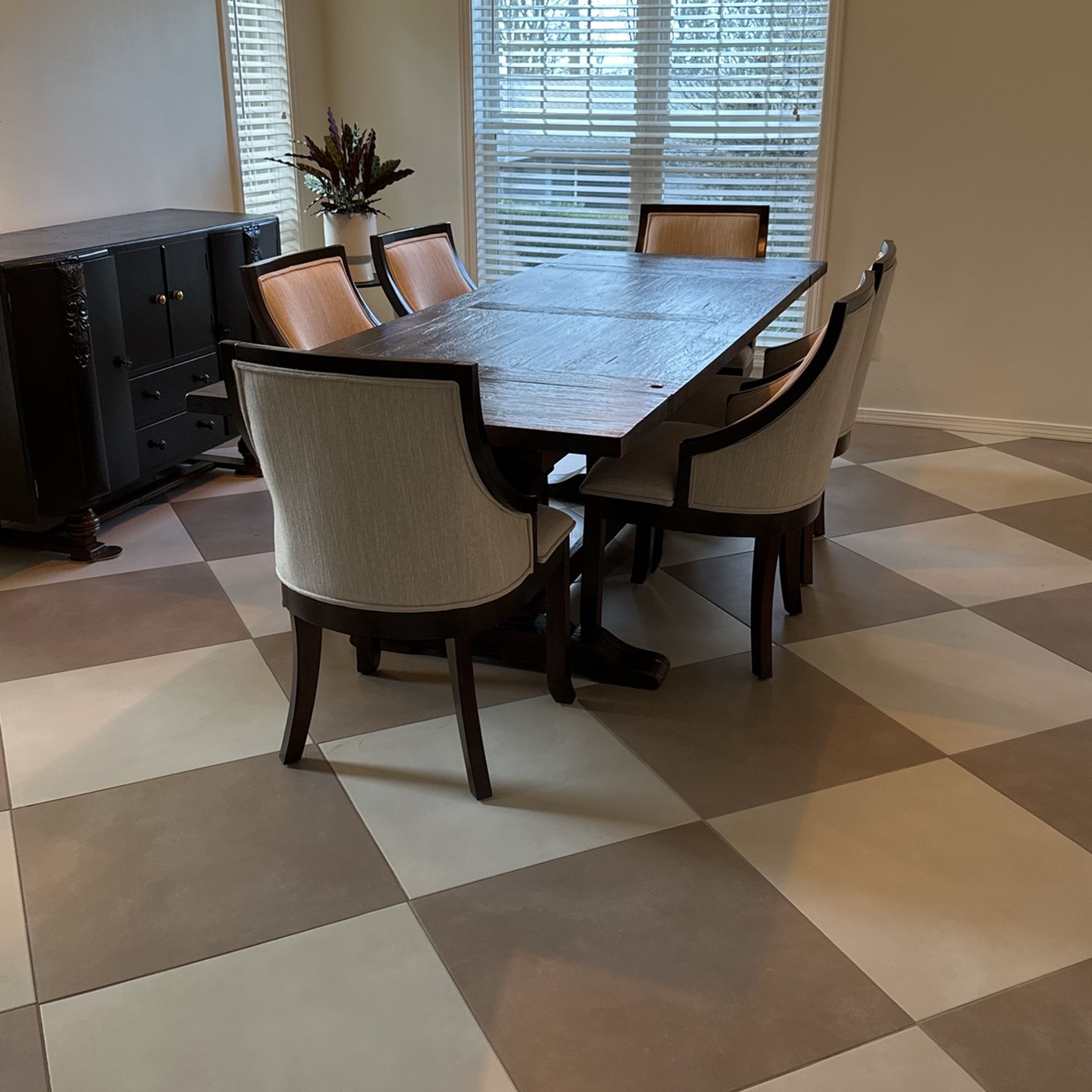 6 upholstered chairs 68” to 96” expandable table x 36” wide. In really good condition but some discoloration on top of table.