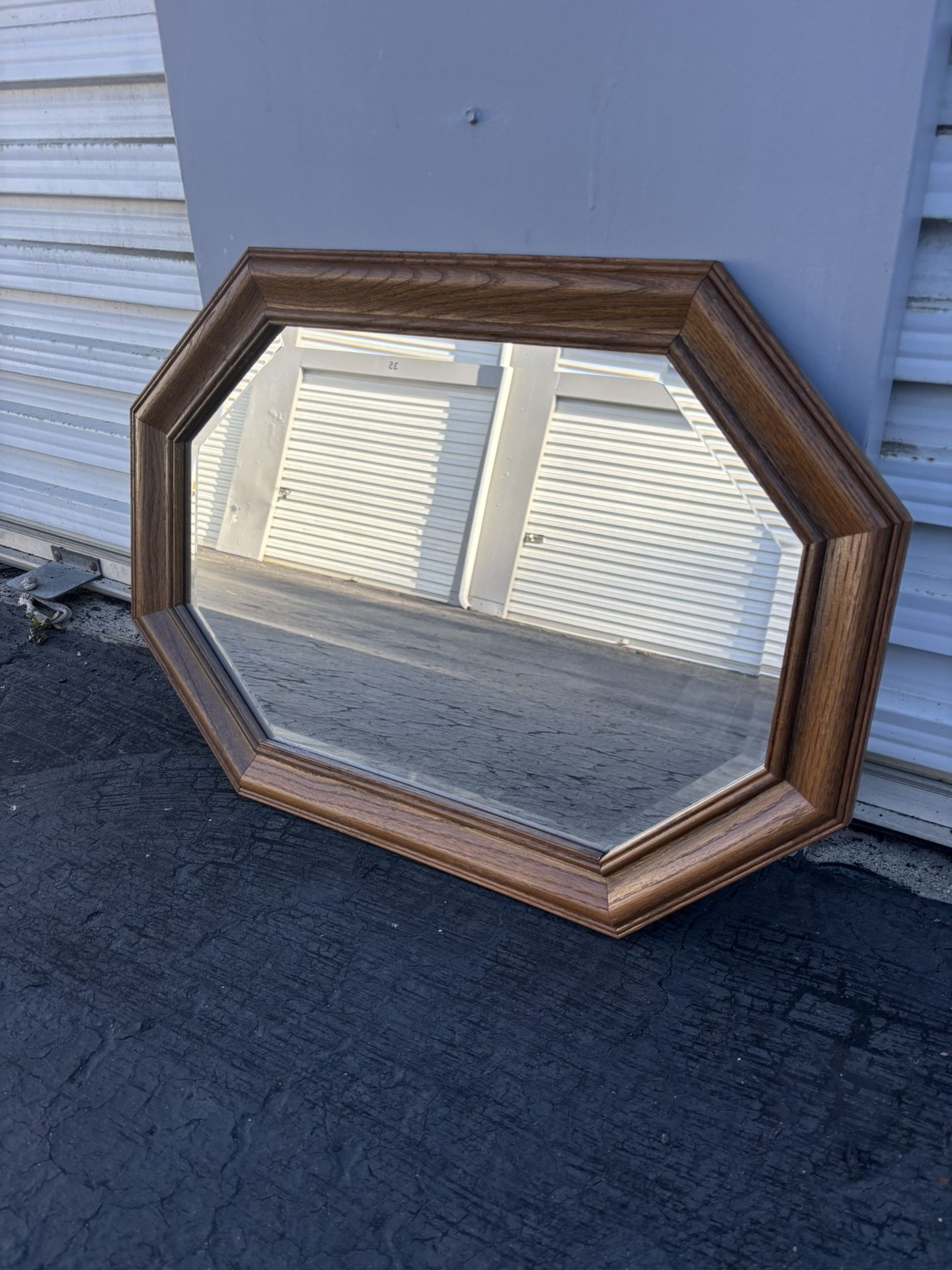 Oak hexagonal mirror Used Beveled mirror glass 28.5” x 20.5” Asking $100 obo Cash or Venmo Located in Grover Thanks for looking