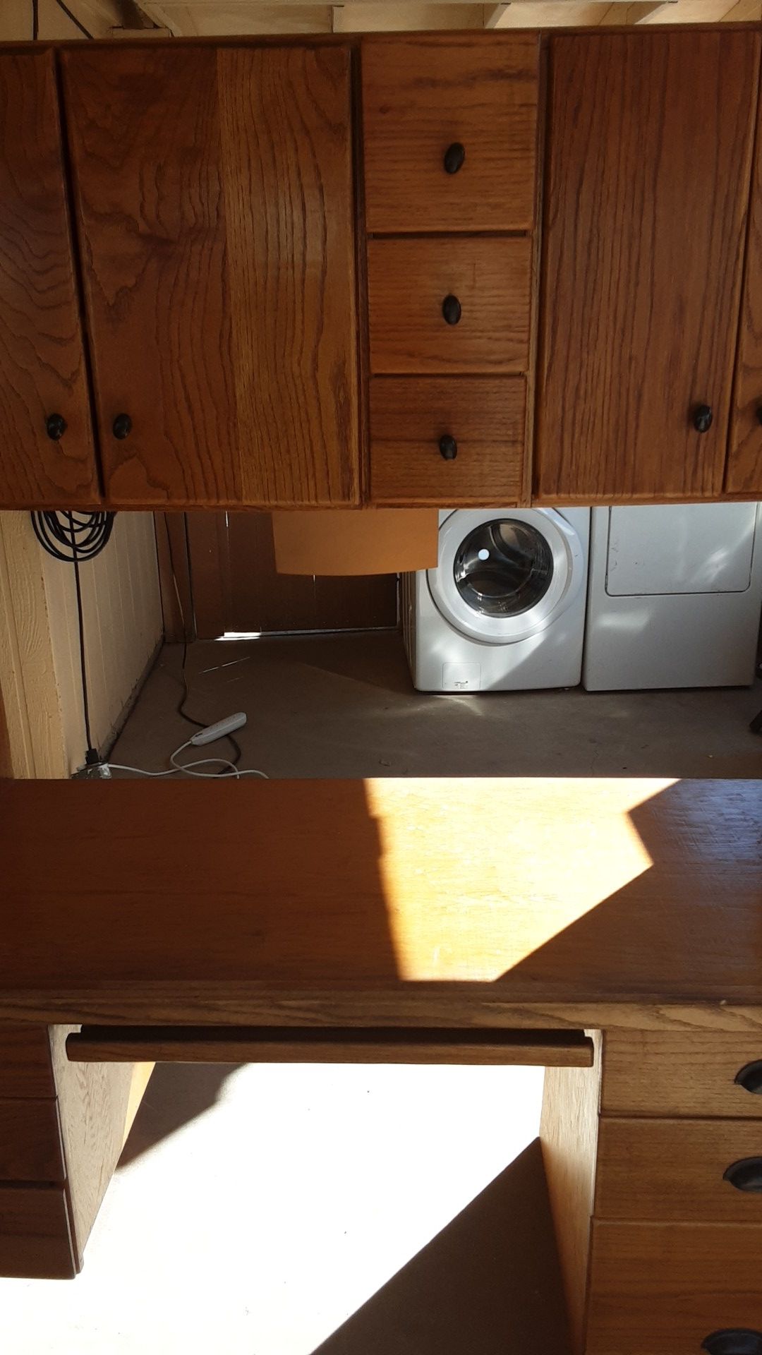 Solid oak custom-made oak desk. Basically all solid oak. Drawers in cabinets.