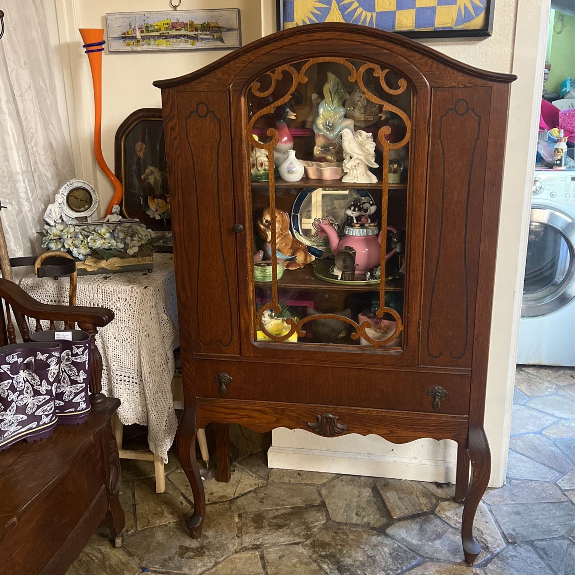I purchased this cute curio cabinet from an auction. Supposedly according to the tag it was used in the Disney movie haunted mansion. The tag said it was from the living room. It is 62 inches high 15 inches deep and approximately 37 inches wide. It’s super cute and it has a nice little drawer. We are remodeling and I don’t believe I will have a space for it. It’s looking for its new home.
