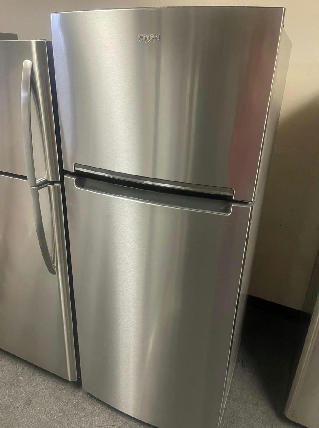 This used Whirlpool Top Mount Refrigerator in stainless steel is in excellent condition. The exterior has minimal surface scratches, and the interior is clean with clear, adjustable shelves. Enjoy the energy efficiency and convenience of crisper drawers and LED lighting. Comes with a 60-day warranty. Same day delivery available. DM / Message us for more info. Hablamos español.