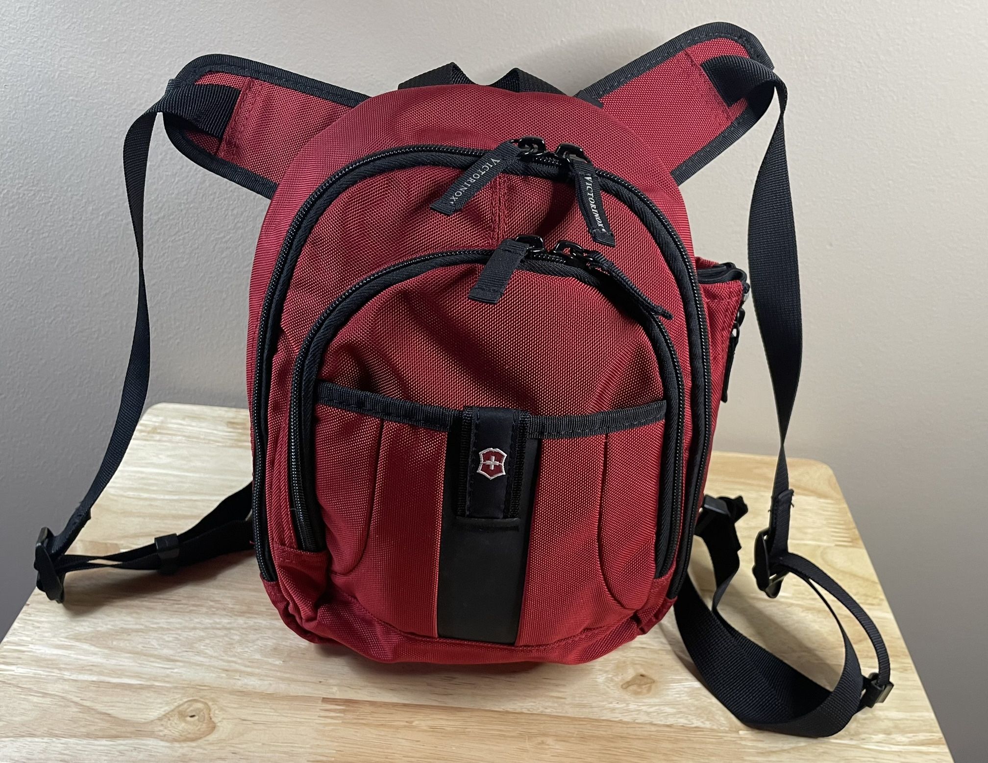 Victorinox Red Mini Backpack, 10” tall, multiple compartments including organizer pockets, key fob, and expandable side pocket for water bottle or umbrella. Made by Victorinox, Maker of the Original Swiss Army Knife. Excellent condition, unisex. Perfect for travel, commuting, or everyday use.