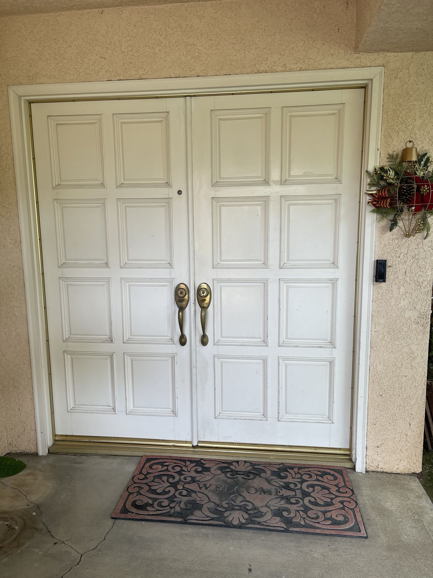 Solid wood front door is in very good condition. It has extra security - you can bolt it from inside and use peep hole and it also has chain lock from inside. Beautiful white color that’s easy to match any house exterior paint color. Includes exterior wood frame too and locks/keys. Measurements: 80” high and 72” wide