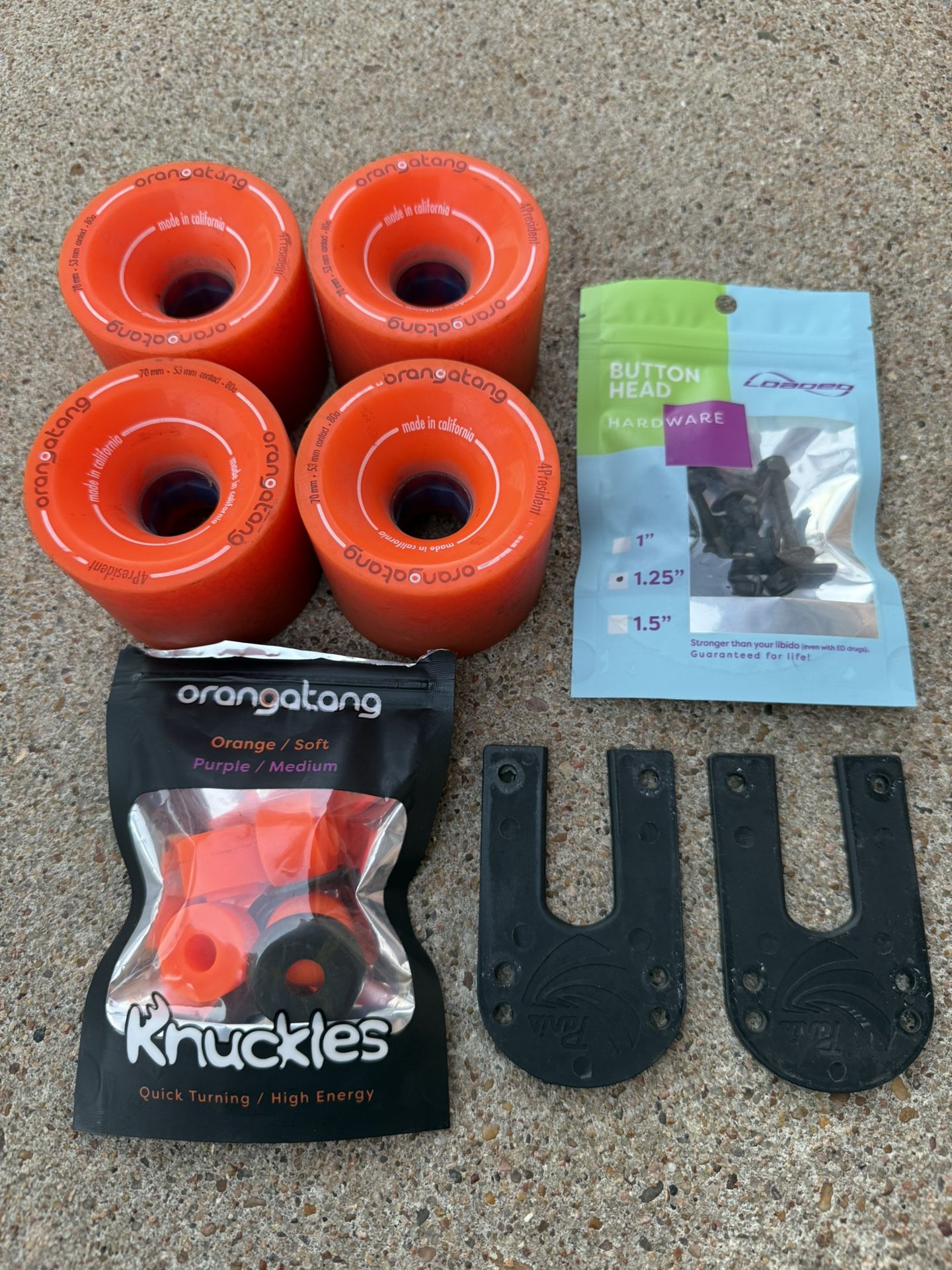 Used 4President, 70mm Orangatang wheels With new loaded button head 1.25 hardware. Used Orangatang orange soft knuckles and 2 Paris riser pads