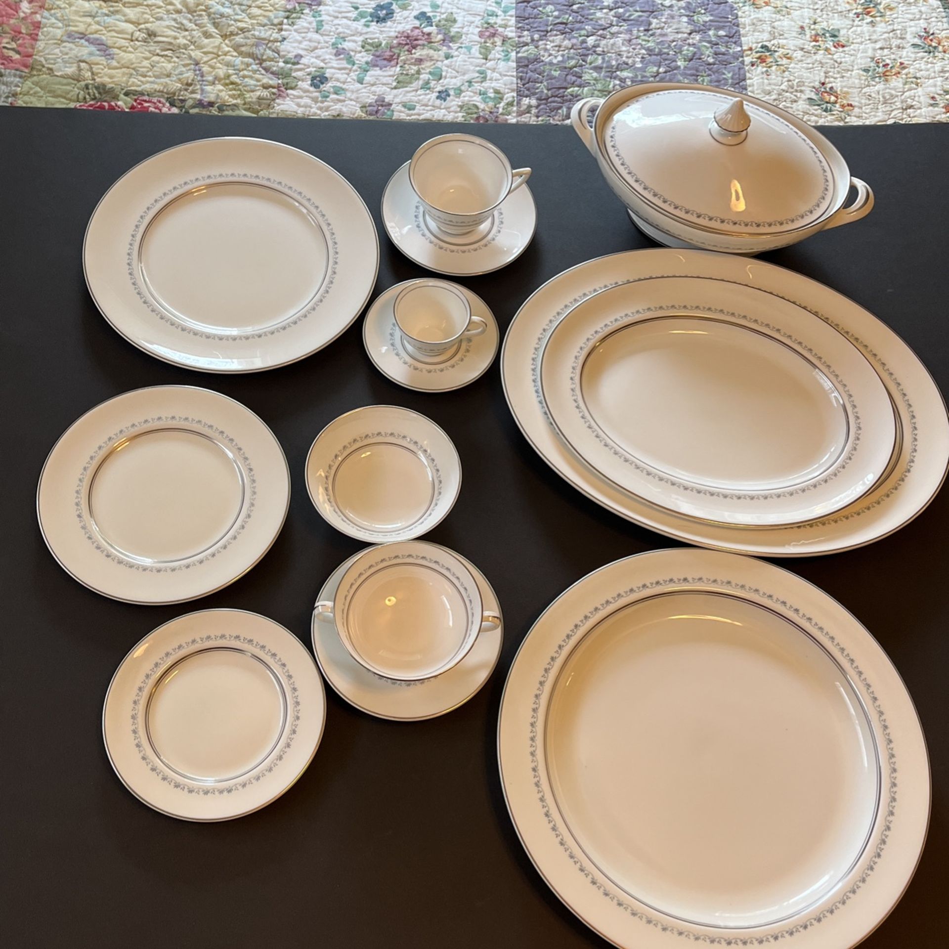 Pattern is Blue Grey flower vine with platinum trim. 12 each dinner and dessert plates, cups/saucers, fruit bowls. 11 each bread butter plates and demitasse cups/saucers. 9 handled Bouillon bowls/saucers. 3 platters and 1 covered oval vegetable bowl. Willing to sell partial set/ pieces.