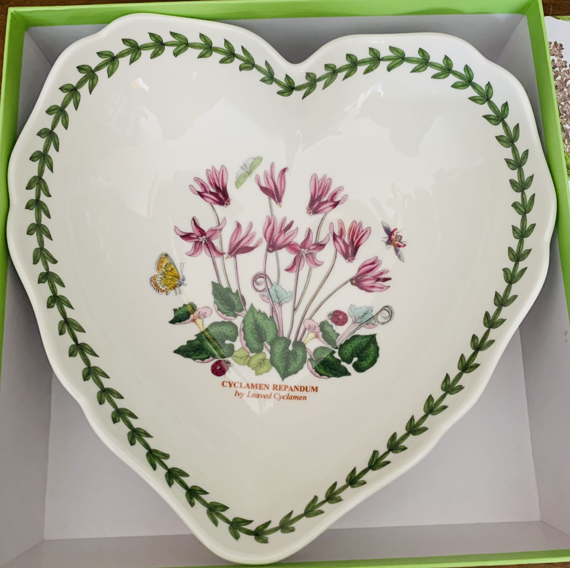 Portmeirion Heart Shaped Dish In Box This beautiful scalloped edge dish is in new condition. It is still in the box and has original sticker on the back. Its pattern is cyclamens with vivid purples, greens, and butterflies. Never been out of the box. Pu: 48/capehart, border Papillion & Bellevue. Cash, Venmo or PayPal.