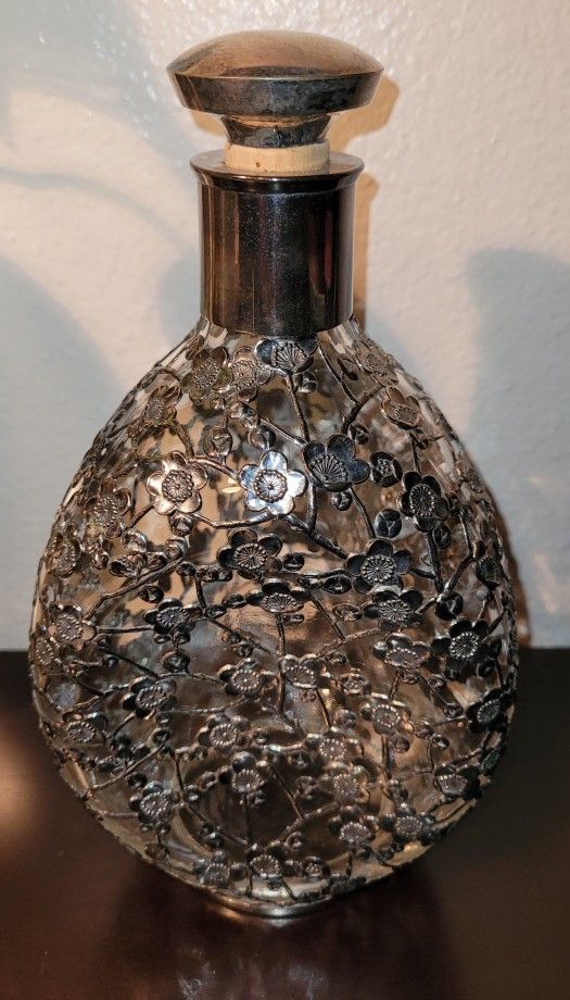 Vintage glass Decanter with silver tone metal floral overlay, very nice thick clear glass bottle with topper. Rare Find, some tarnish but in good vintage condition