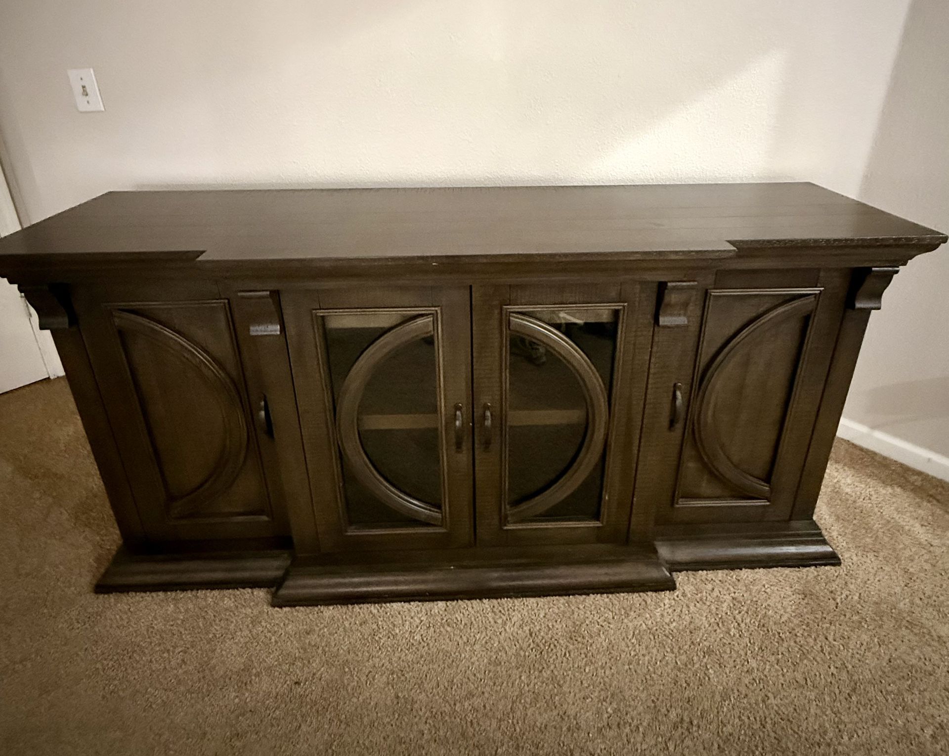 Beautiful solid wood sideboard from Costco. Heavy, high-quality piece with glass doors and adjustable shelving. Very clean, no damage. Perfect as a TV stand, buffet, or storage cabinet. Dimensions available upon request Pickup preferred – delivery available for extra