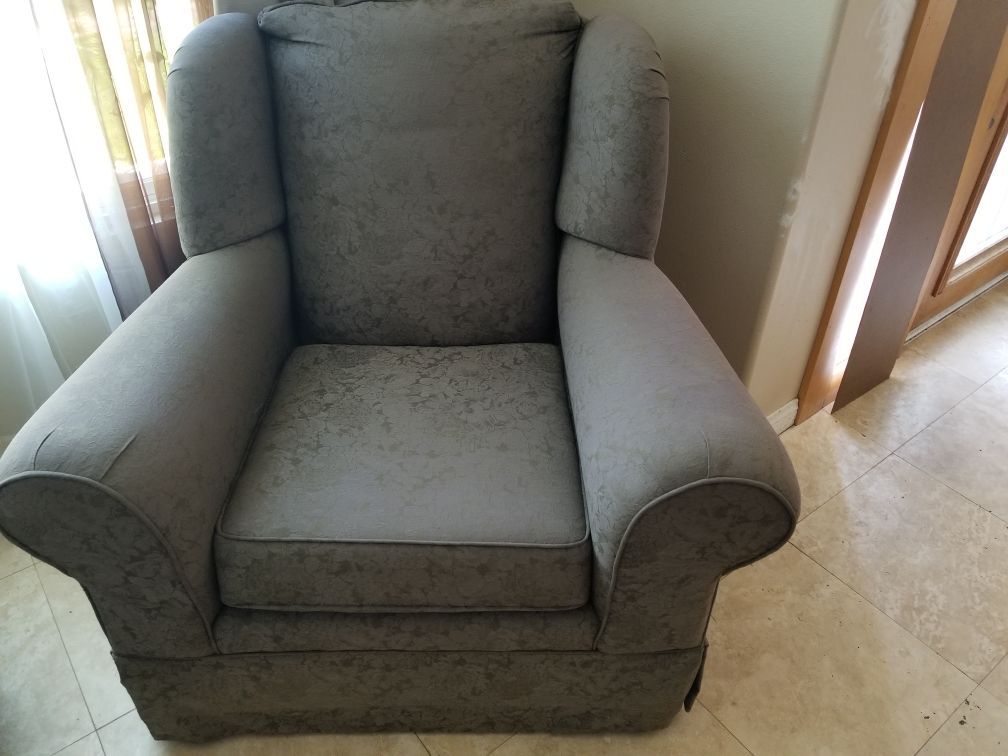 Two green chairs. One has small teat on bottom corner. Sides a little faded.